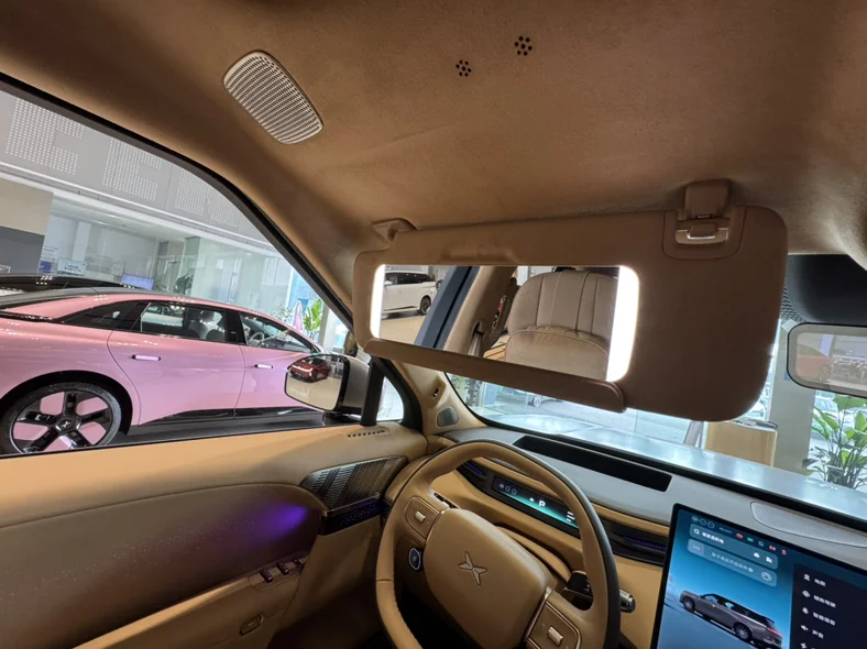 车内采用大面积Nappa真皮、Microfiber超纤绒顶棚,质感大提升,还有化妆镜也采用翻皮的这个操作,非常高级。