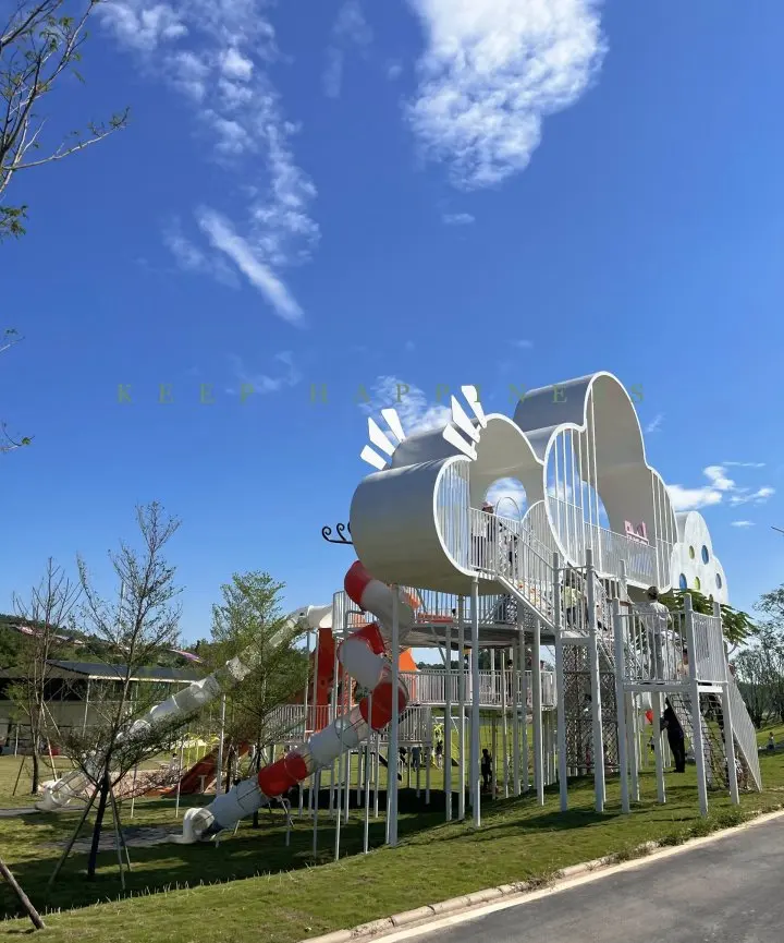 对于带娃家庭来说,这里简直是天堂。园区里有设计感十足的云朵滑梯和儿童游乐设施,孩子们在草地上奔跑、滑滑梯,笑声不断。
