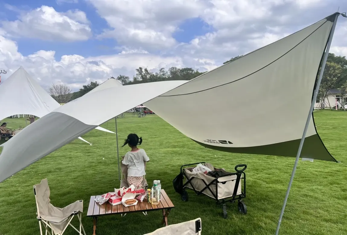 一进园区,映入眼帘的就是大片的开阔草坪。支起白色的天幕,搭上蛋卷桌,瞬间就有了度假的感觉。这里视野极佳,蓝天白云下,远处的山峦起伏,空气里都是草木的清香。