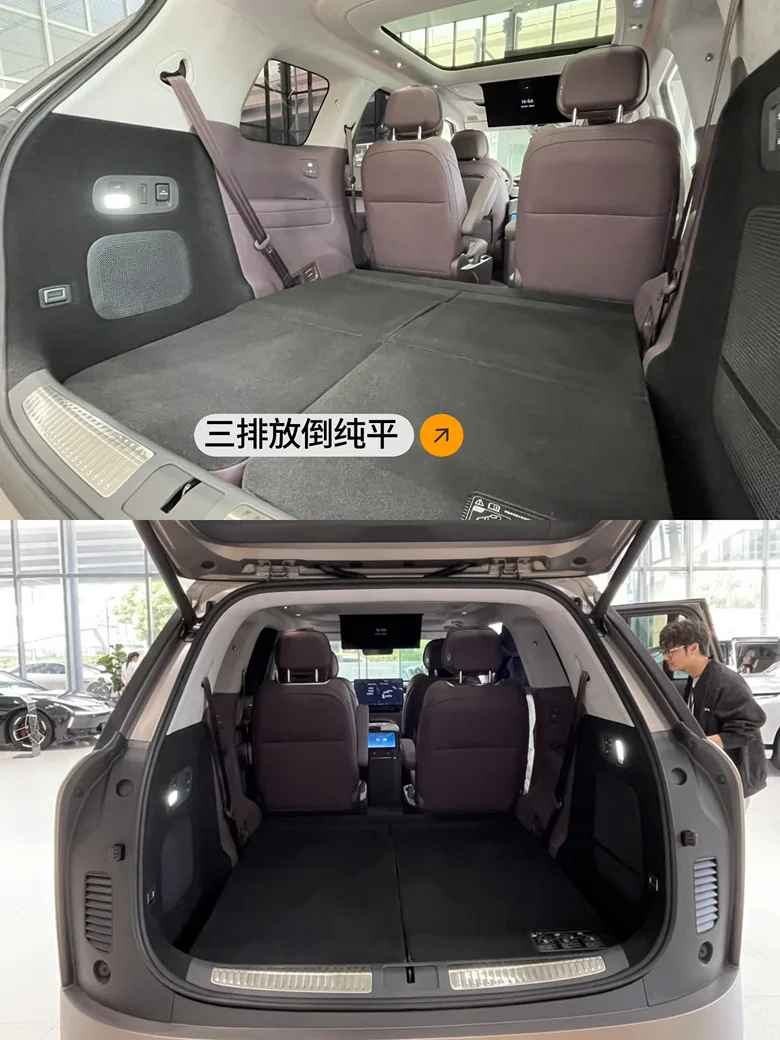 GX真正的优势,藏在细节和实用性里:全车丰富的电动调节按钮,让每一项功能都触手可及;三排放倒后能实现纯平空间,后备箱的装载能力堪称恐怖,储物空间比L9和D19都要大得多,不管是长途自驾还是搬家拉货都毫无压力。二排的航空阅读灯和环绕式空调出风口,也给乘坐体验加了不少分。不过氛围灯还是延续了P7的设计思路,仅作为点缀式灯光出现,不算很突出,少了点氛围感。