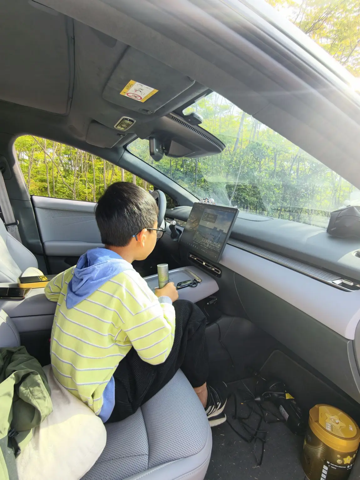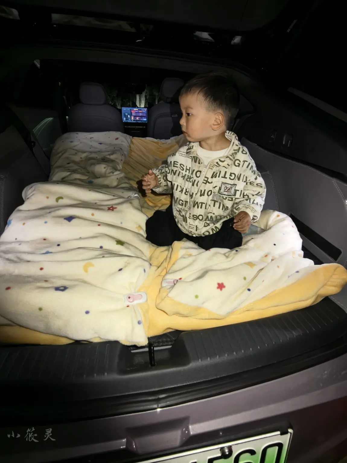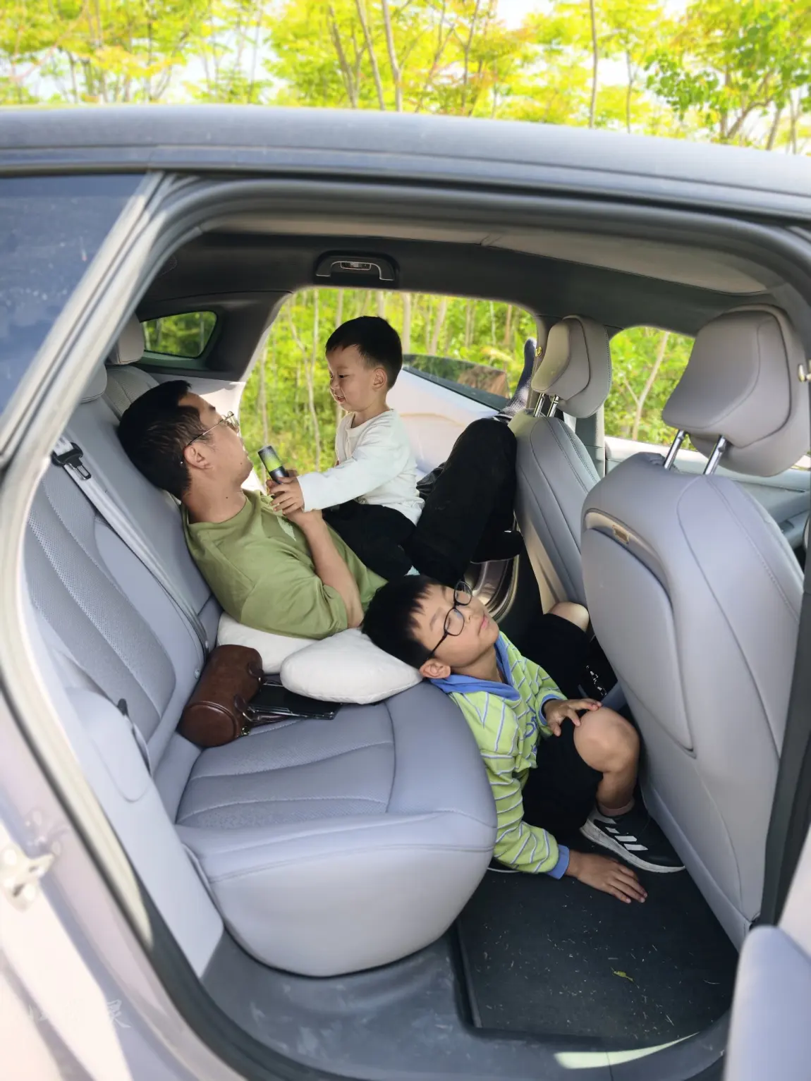 我们在停车场一隅暂安营寨🏕️,后排座椅纯平放倒后,纵深空间直接翻倍,完全就是一张双人移动大床,两个成人也能轻松容纳,躺平休息毫无局促感。商量后决定:我与二儿子负责守着车厢,老公与大儿子、小儿子则在帐篷里,听风入梦。