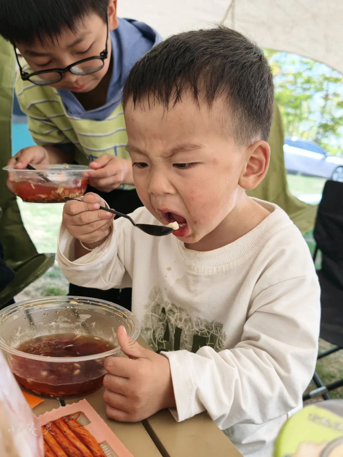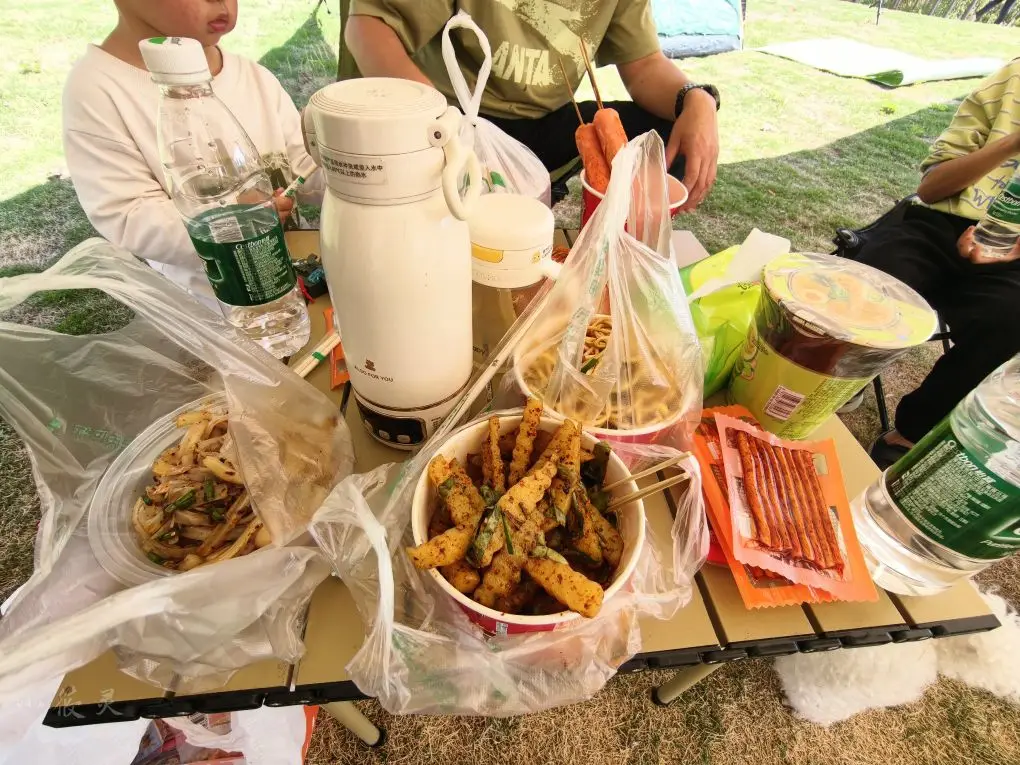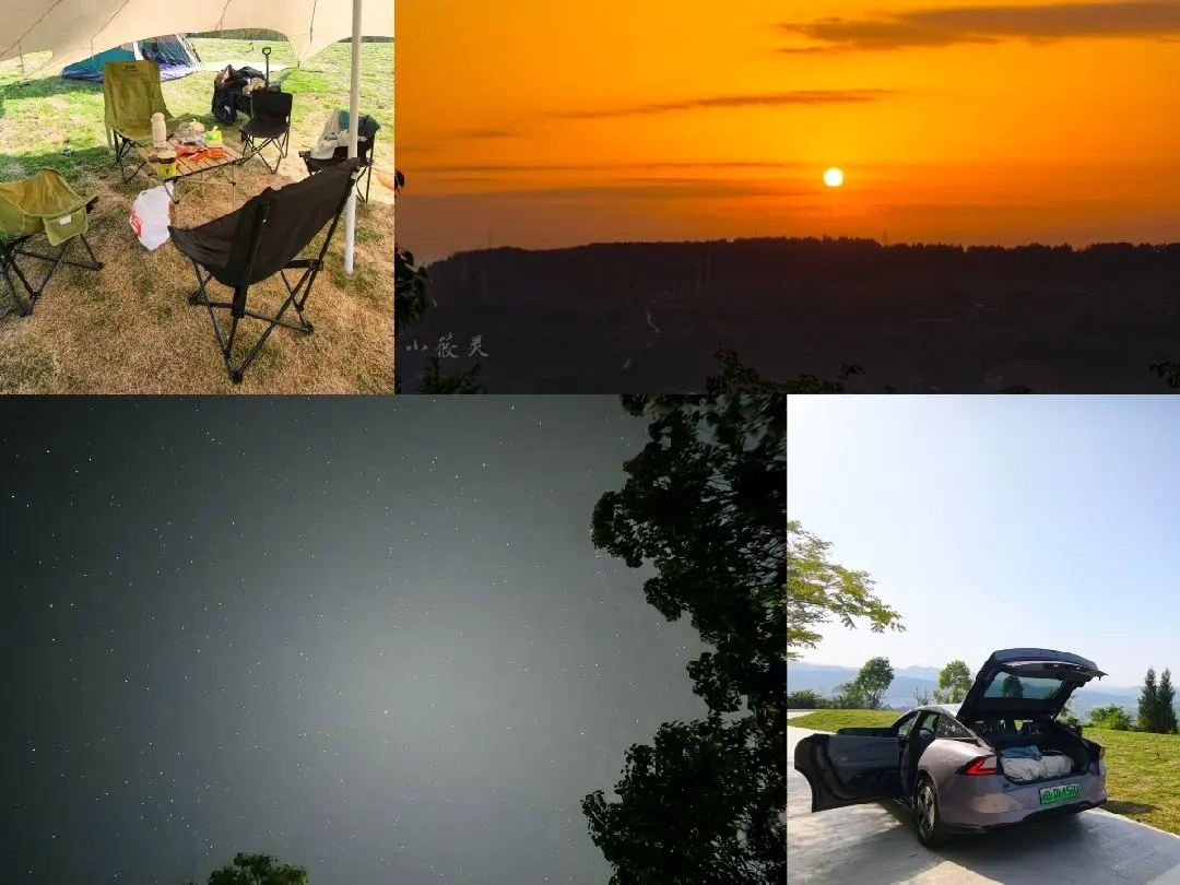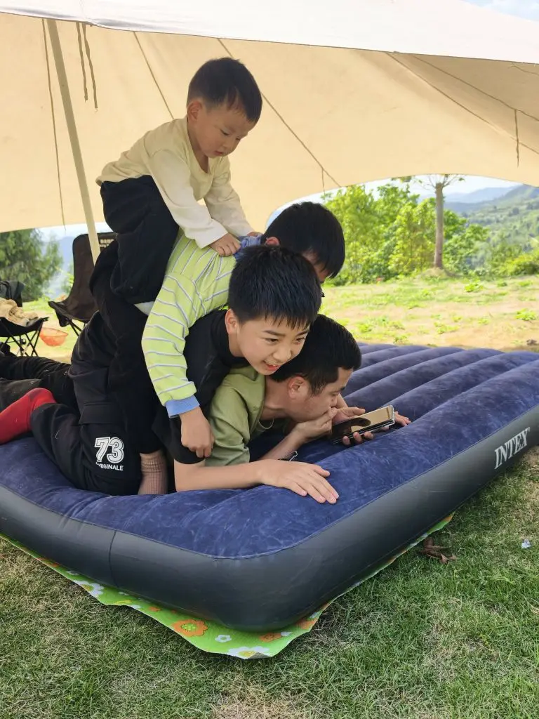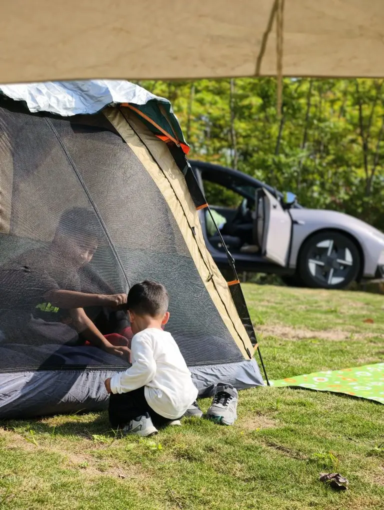 这时阳光正好。孩子们在草地上肆意追逐、在帐篷里上下蹦跳,笑声清脆;我和老公在车里K歌放松,歌声飘向山野。不知不觉,又来了两家人露营,欢声笑语交织,更添热闹。