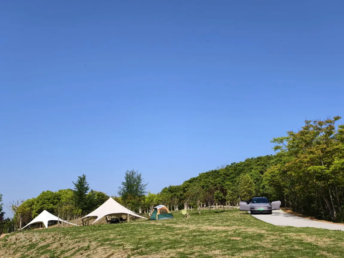 原来这里是宝藏之地!巨大的草坪上,两个免费天幕早已等候。我们迅速转移阵地,将帐篷安扎在绿茵茵的草地上,P7+静静停靠在旁。