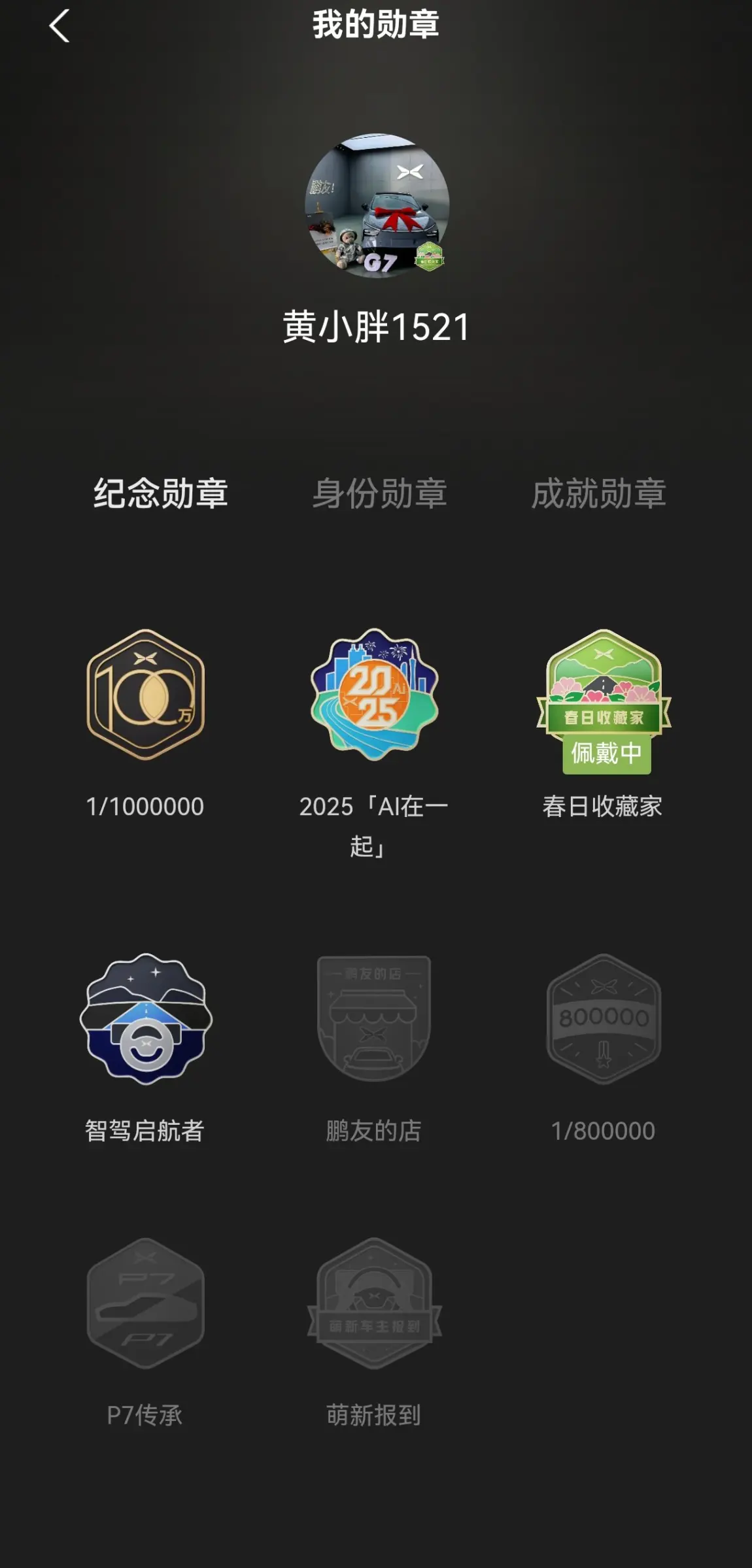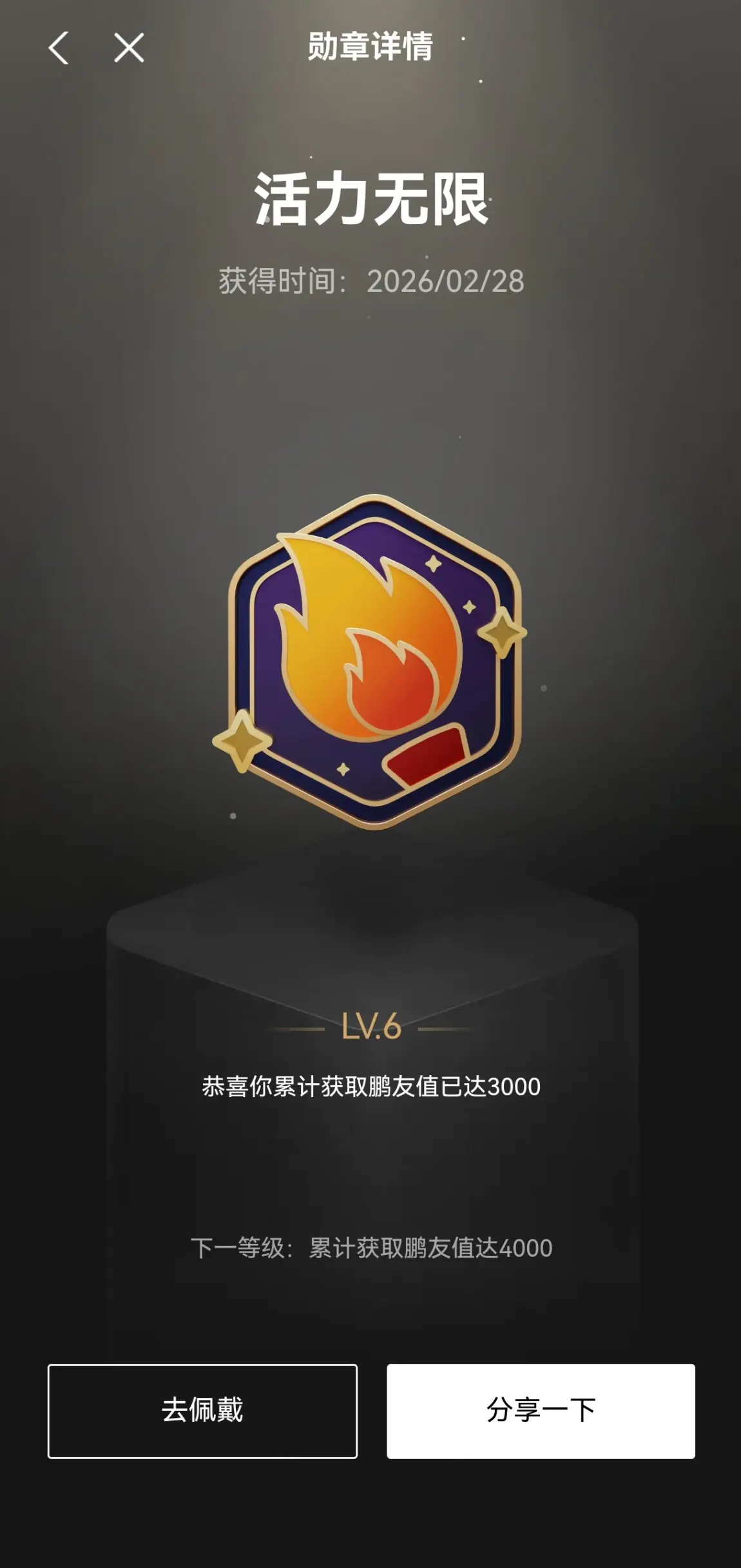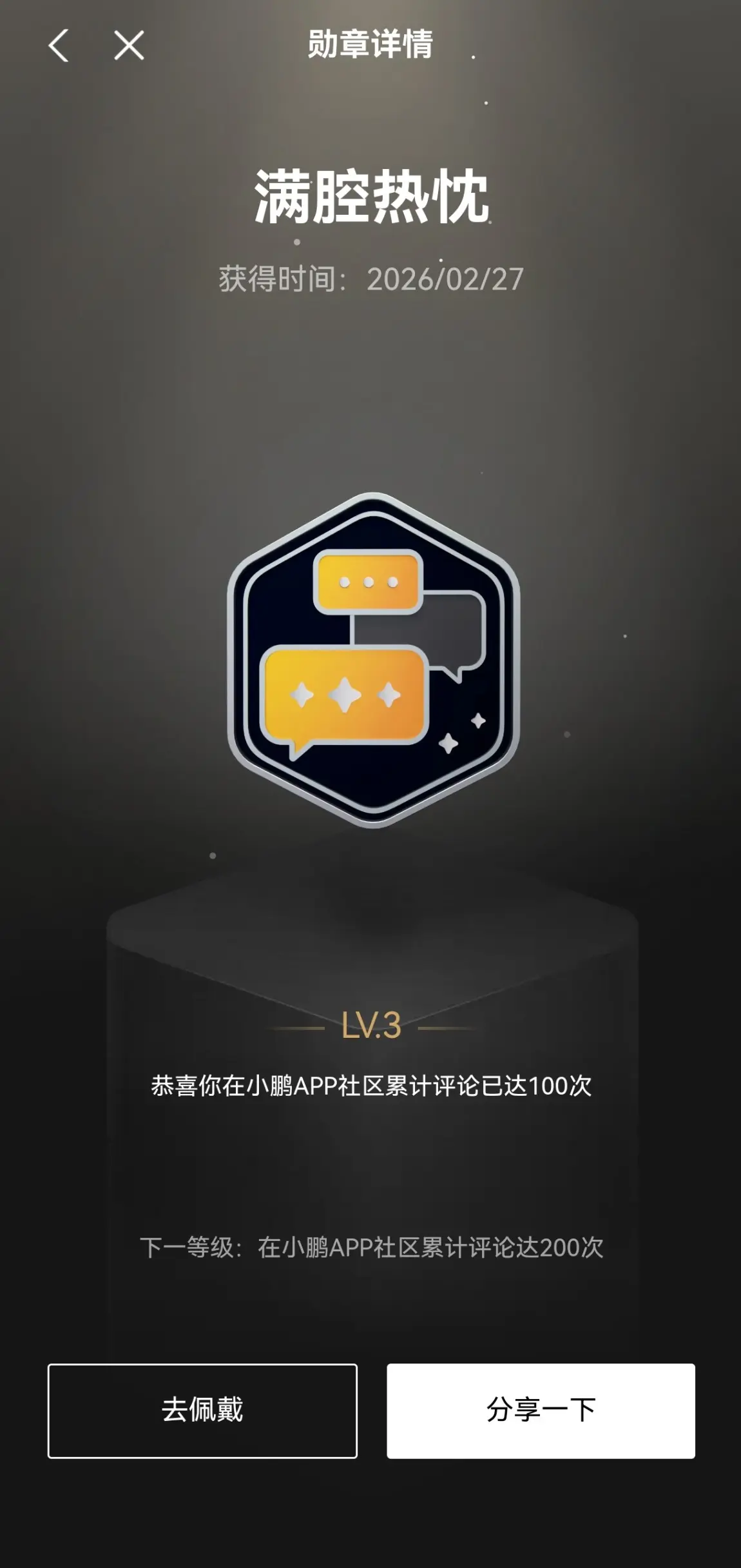 · 勋章故事: LV.6,3000鹏友值。这枚勋章是“活力无限”的象征。鹏友值的积累,来自于我上面提到的所有行为:发帖、评论、签到、使用智驾、充电……这3000分,是对我整个小鹏生活的一个综合评分,它告诉我,我的“鹏友”生活,正充满活力!