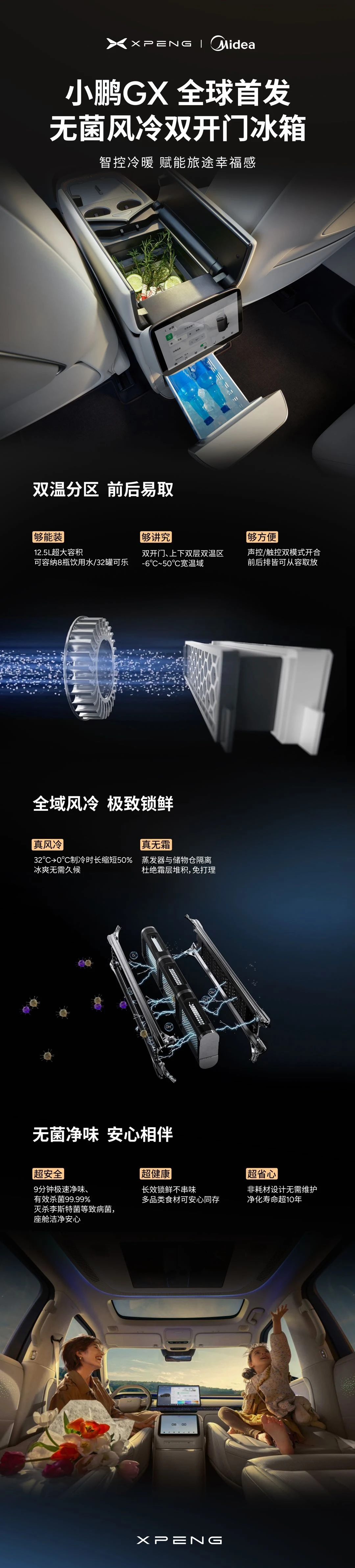 小鹏汽车联合美的集团,全球首发无菌风冷双开门车载冰箱。