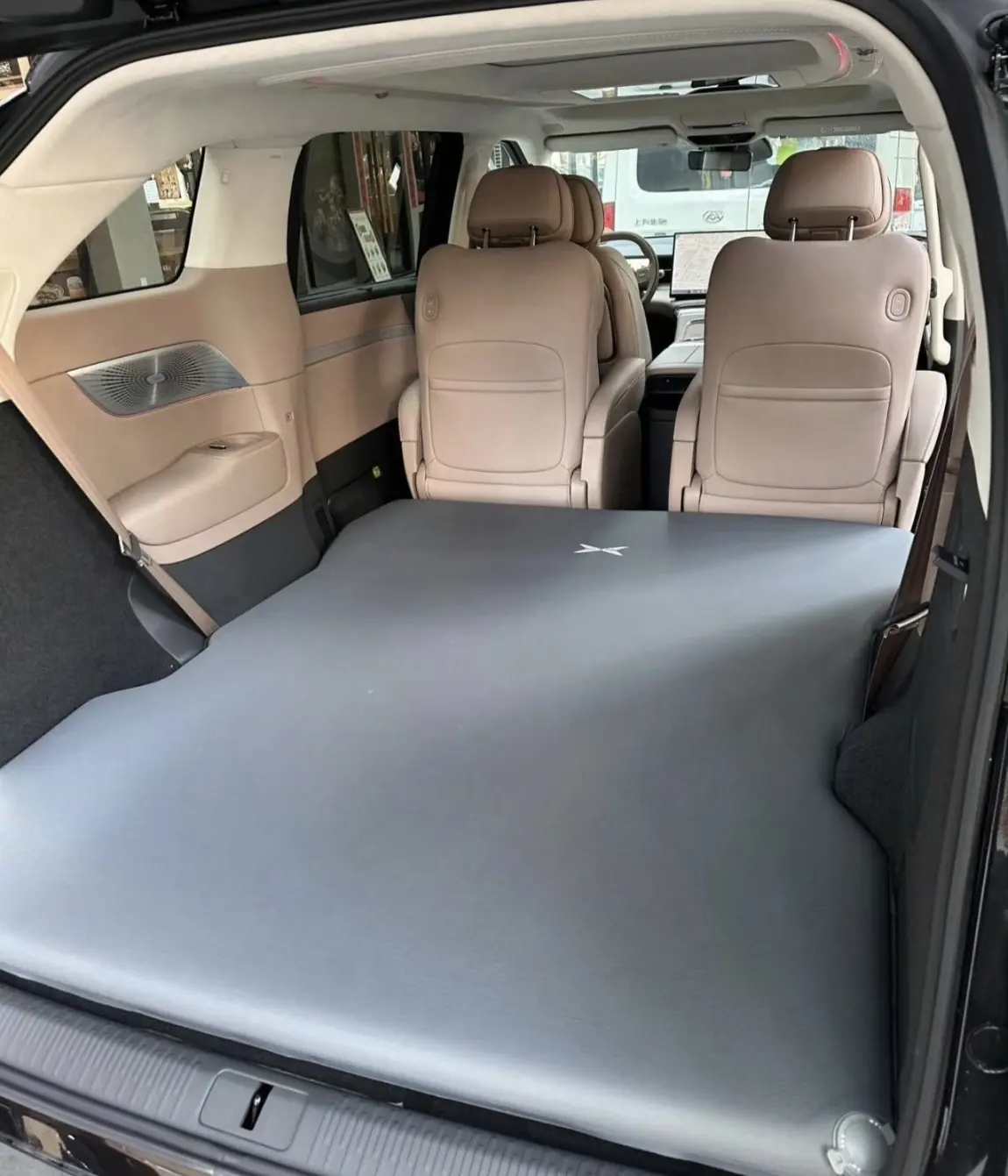 X9的三排座椅折叠功能,把第三排座椅完全放倒后,后备箱瞬间拓展成超大平整空间,直接铺上充气床垫,秒变移动大床房。在湖边玩累了,就能回到车里躺平休息,吹着空调、看着窗外的湖景,舒适度直接拉满。