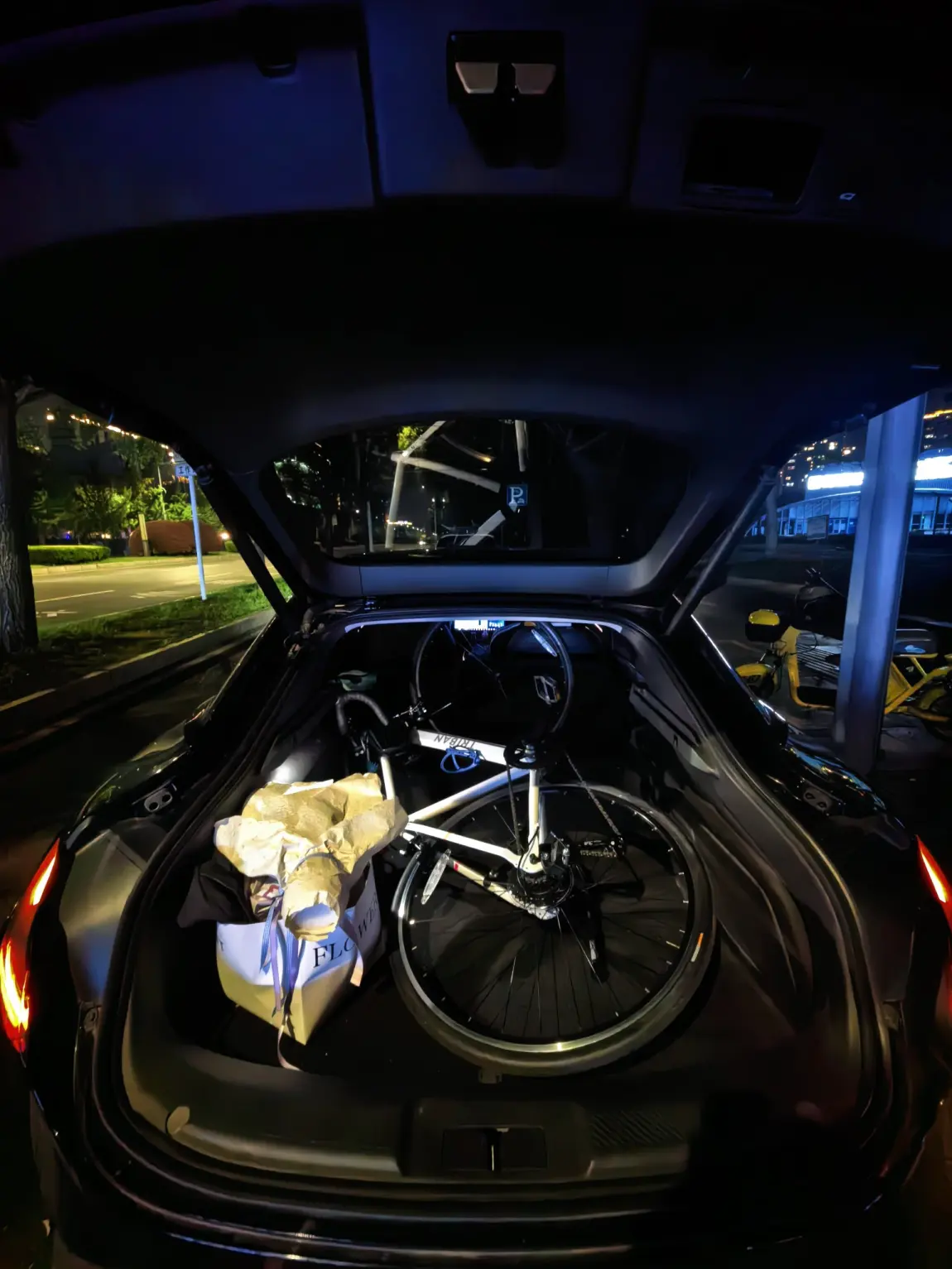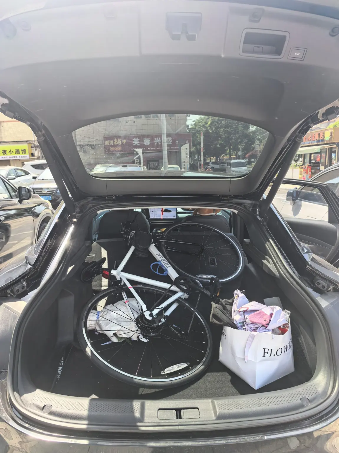 首先先展示一下MONA的超大掀背后备箱,居然能完整地塞下一整个成人自行车🚲!作为一个A级车,这在同价位来说是很难的!因为这对后备箱门的开合角度和后备箱的高度有着很大的要求!后备箱的深度其实后排座椅放倒都够,但是高度和开合角度决定你能不能塞的进去!MONA的超大掀背后备箱完全不用担心!后备箱门的掀背开启方式可以有很大的角度让自行车能够轻松放进去!不止是X9,我们的MONA也能轻松户外骑行🚴!