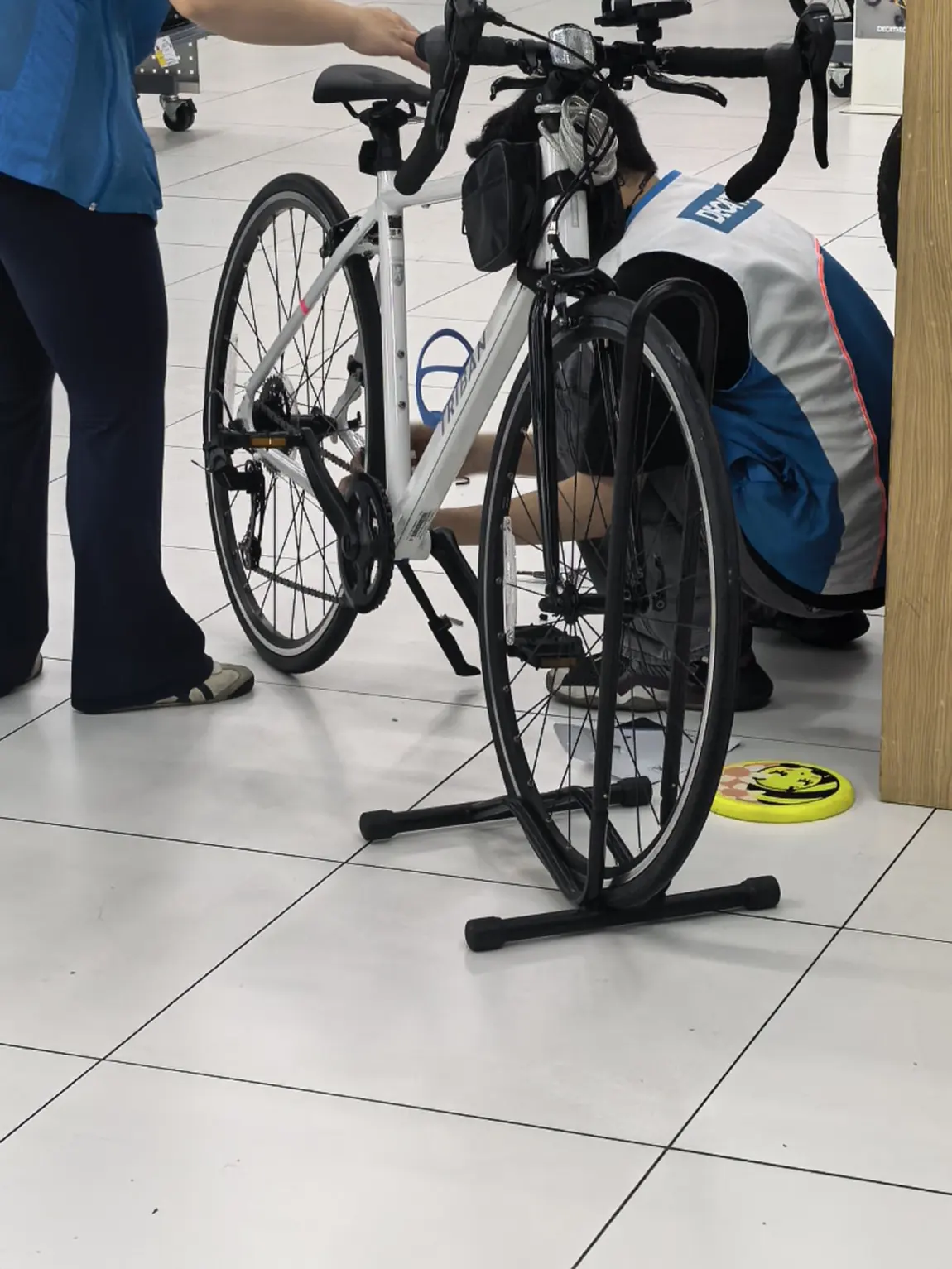 我们先是前往万达广场迪卡侬店铺,直接开往停车场🅿然后把自行车拿下来推往店铺里面。迪卡侬的工作人员态度特别好,帮我们免费安装支架的同时,还给我们做了一个免费自行车胎检测!