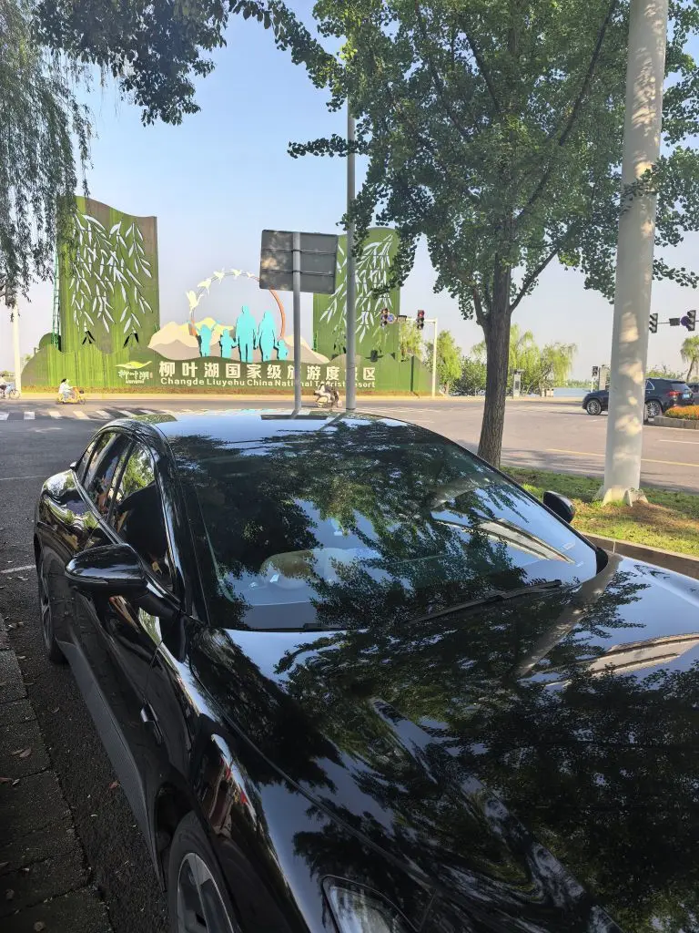 一切准备完毕后,我们就开车前往最终目的地-柳叶湖度假区,大家如果有想来的话可以车就停在这个标牌这儿里,这儿是骑行的起点,路边也都有停车位,非常方便!到达目的地当然要来一张合影啦!
