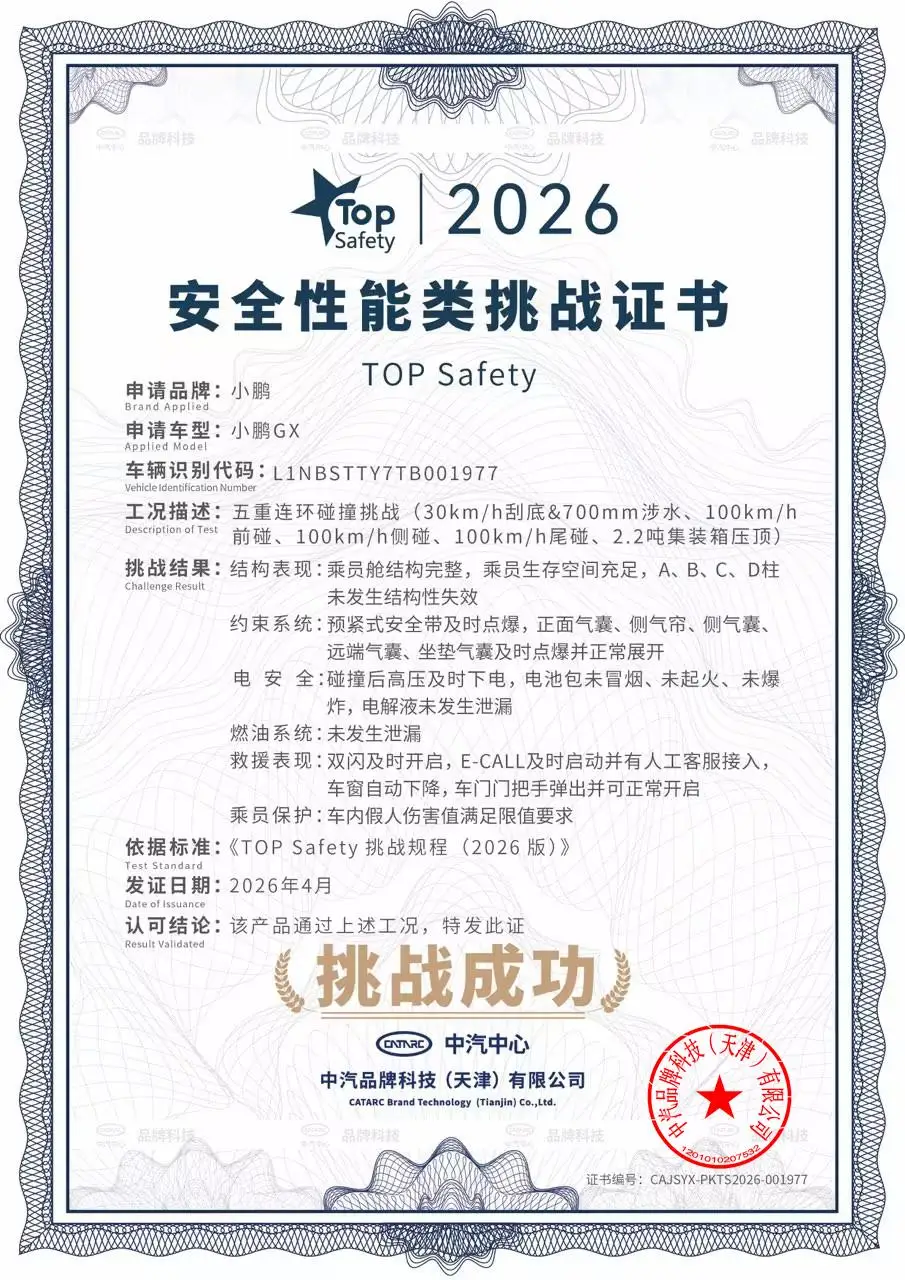 当然,对于家用车来说,安全永远是第一位的。小鹏GX在这方面的表现可以说是行业标杆级别的。我特意观看了它联合中汽中心完成的720°五重连环碰撞测试视频,整个过程非常震撼。不同于传统的单一碰撞测试,小鹏GX用同一台车连续经历了五项极端测试:30km/h刮底+700mm涉水、100km/h正面碰撞、100km/h侧面碰撞、100km/h左后45°追尾碰撞,以及2.2吨集装箱1米砸顶。测试结果显示,小鹏GX的乘员舱结构保持完整,A/B/D柱没有发生明显变形,所有车门都能正常开启,电池包也没有出现泄漏、起火等异常情况。这背后是16000吨前后一体大压铸车身、2000MPa超强钢以及11个安全气囊的全方位防护,还有对标飞行汽车的航空级六重全域安全冗余 。这样的安全表现,让我对它充满了信心。