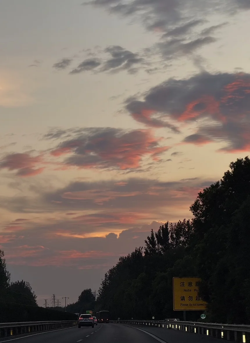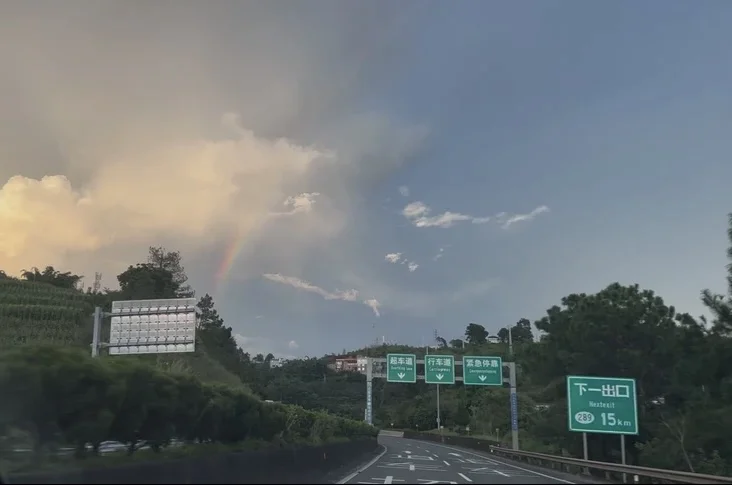 彩虹的颜色淡淡的,和天边的晚霞混在一起,像被揉碎的颜料。车机里刚好在放一首很温柔的歌,看着前方的路牌写着“下一出口 15km”,突然觉得,人生的很多惊喜,都是在路上才会遇到的。
