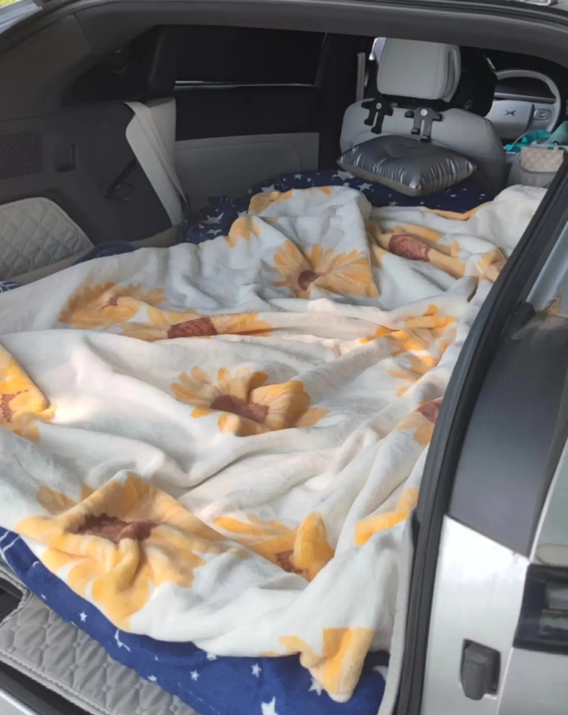 到了晚上如果不想着急回去,还可以把小鹏的露营模式打开,在里面铺上床,又是一个完美的露营酒店了。