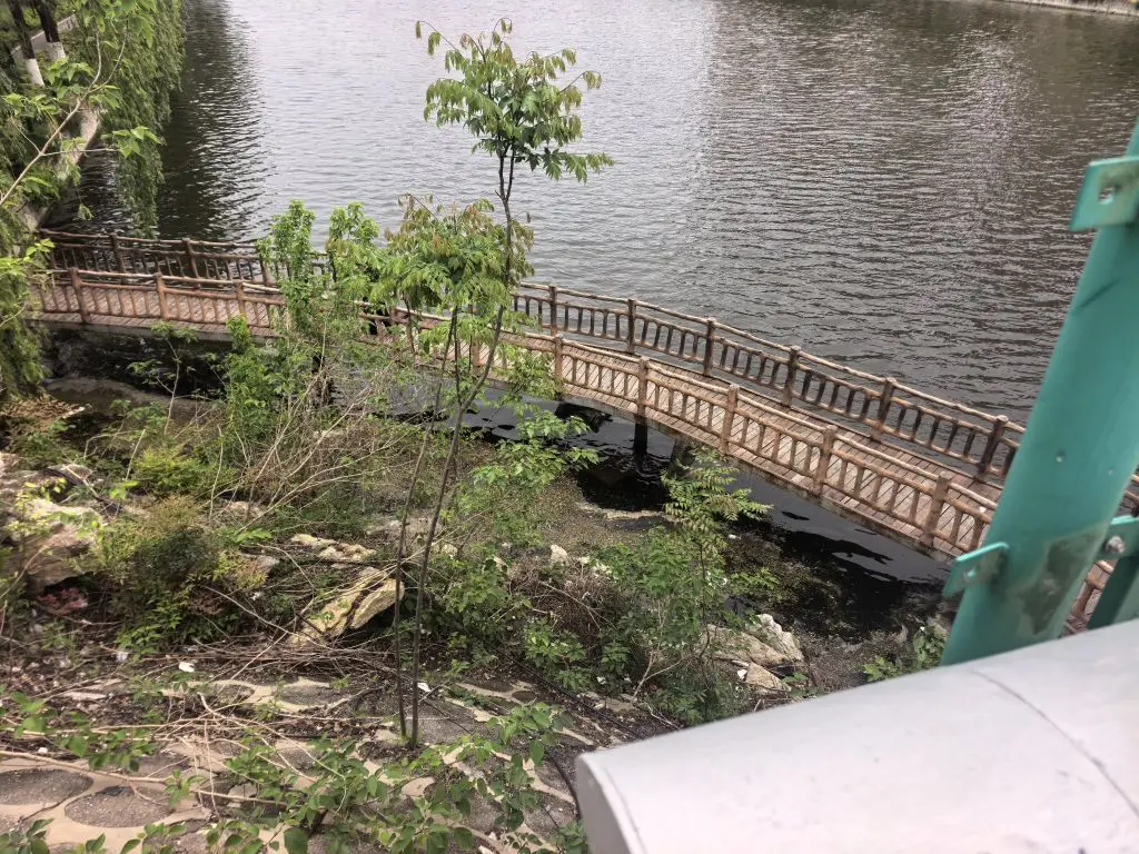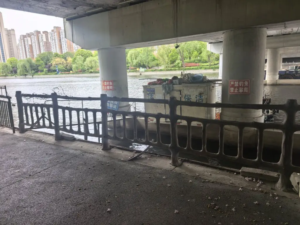 隐蔽之处,自然也有阴暗之景,桥墩之下,间隙中一个矮小的废弃箱体变成了容身之处,更有昔时游船放自荒芜!