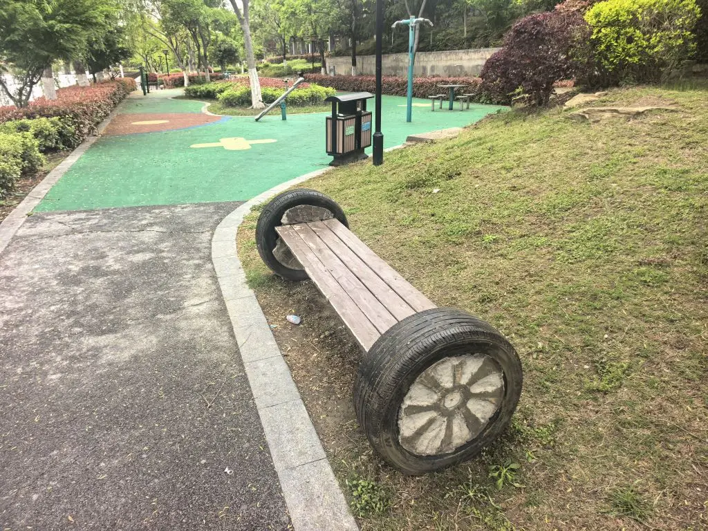 近四十来米的风光带中,最是运动的好场景,篮球场与中老年活动中心,夹杂着儿童游乐设施,跃然一片!几个旧轮胎拼凑出来的休息长凳,不娇柔不造作,颇有一种文明融于自然的恰如好处!