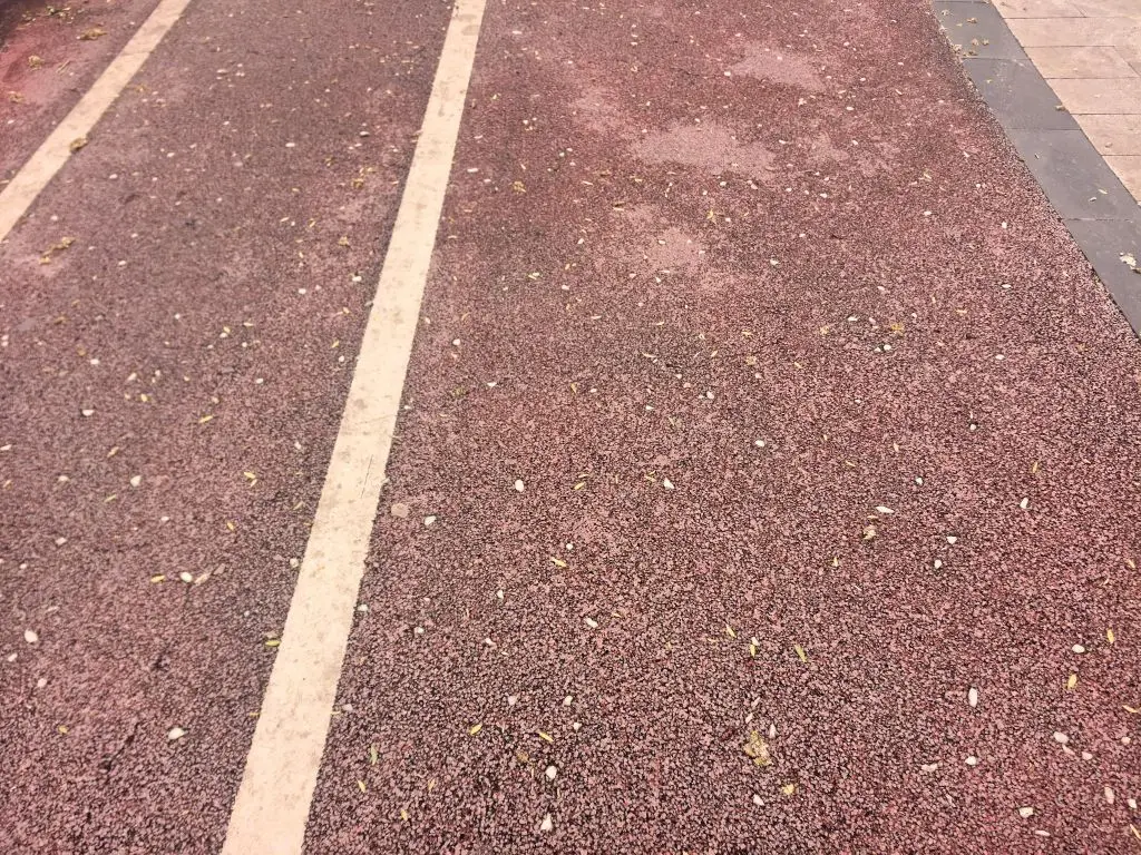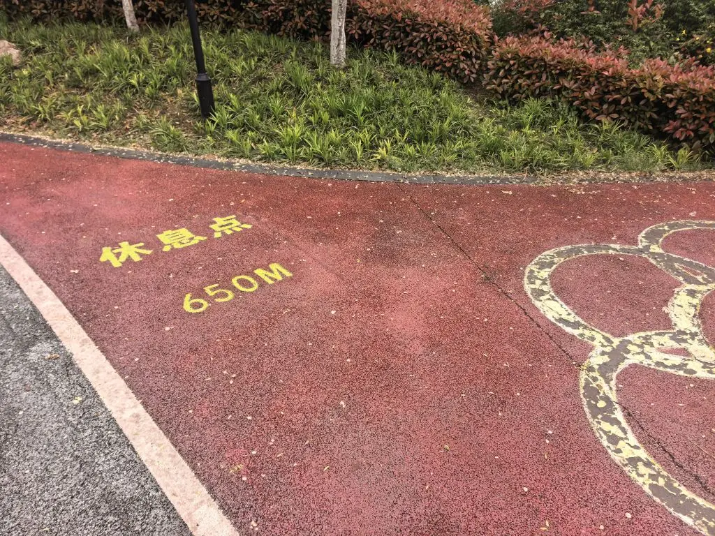在透水沥青步道上,掺杂着少许荧光石,虽然与柳叶混杂难以辨识,但在夜色之中,绿荧点缀,颇有韵味!隔三差五地距离标识与休息点,也添了一丝温暖,貌似父母劝说抬头前行太久,也别忘记停顿休息!
