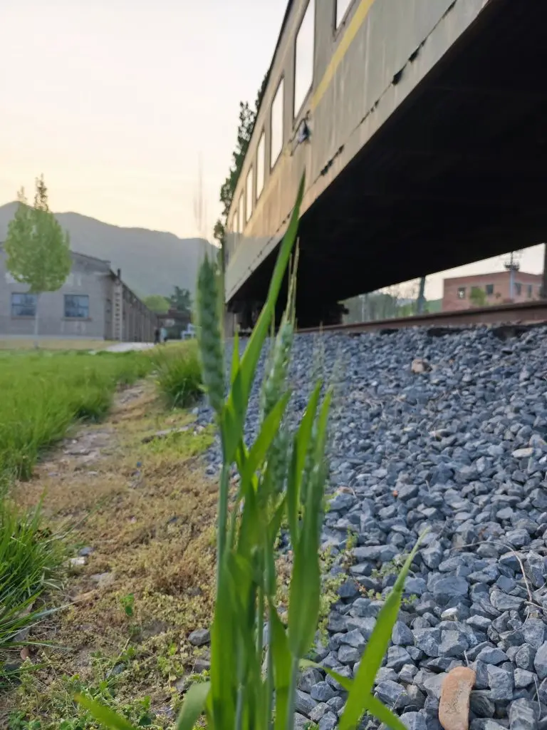 车身呈墨绿色,漆色斑驳,铁轨嵌在碎石间,缝隙里生出几株青苗,长势纤细。火车静立,无汽笛,无人影,唯有车身与铁轨相依,透着几分沉寂。
