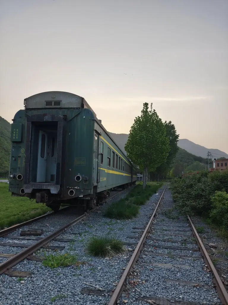 周末驾车进山,随意行驶,行至山路转弯处,便遇见一列停在铁轨上的绿皮火车。
