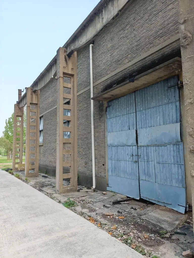 前行数十步,是一处废弃厂房。砖墙裸露,墙面泛着陈旧的灰黄,蓝色铁门锈迹斑斑,半掩着门扉。院内水泥梁柱直立,无多余装饰,地面散落着细碎杂物,杂草从砖缝、墙角悄然钻出,肆意生长。