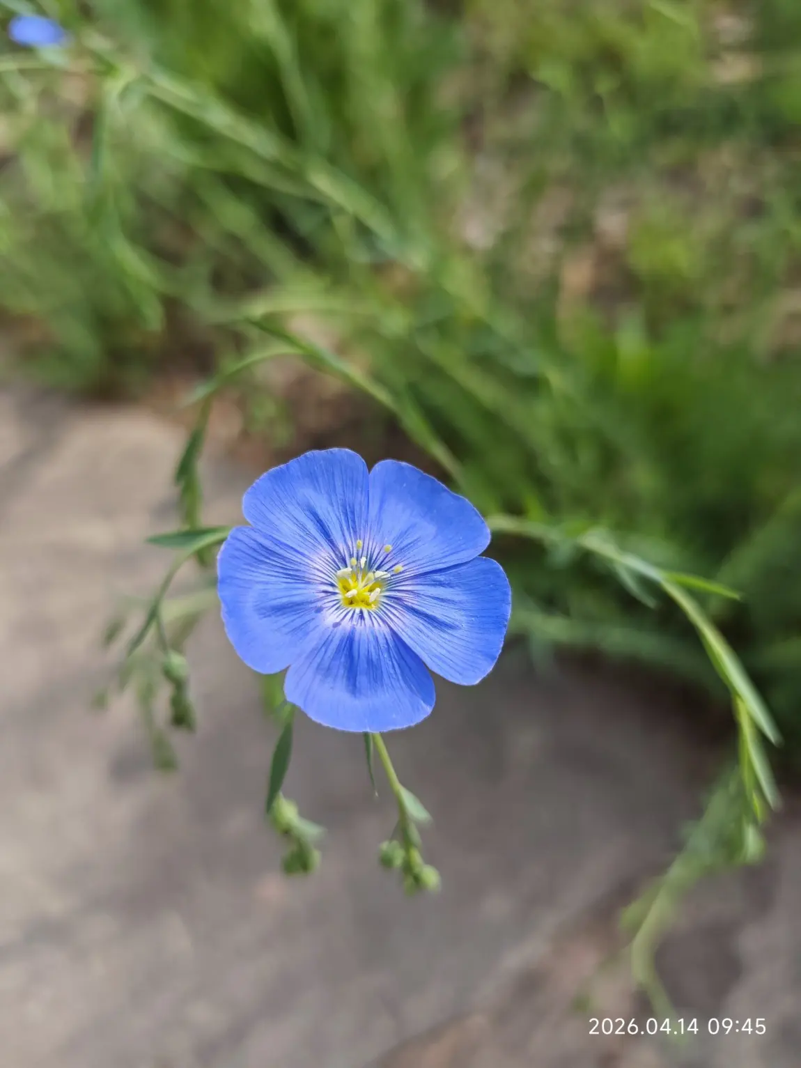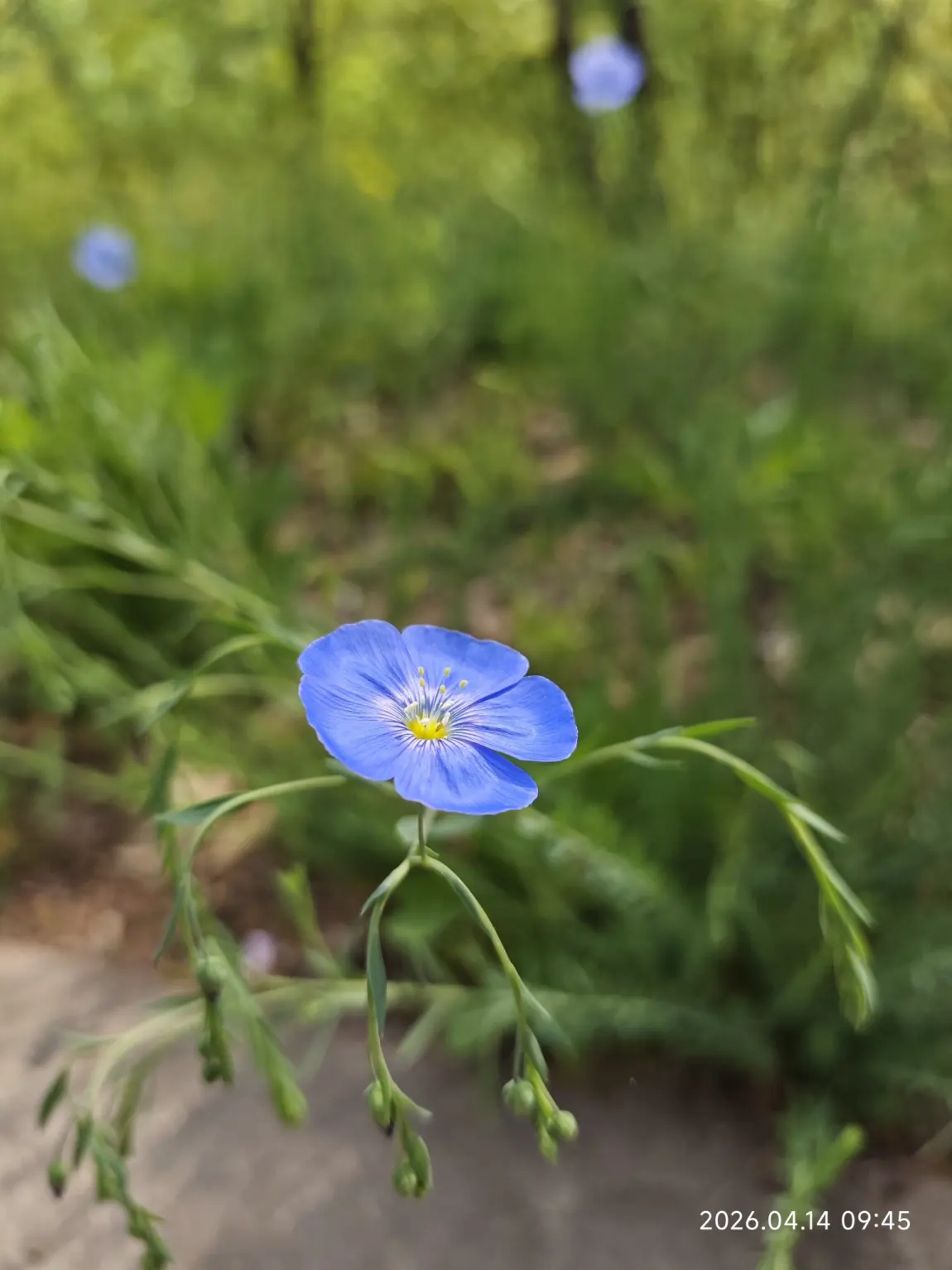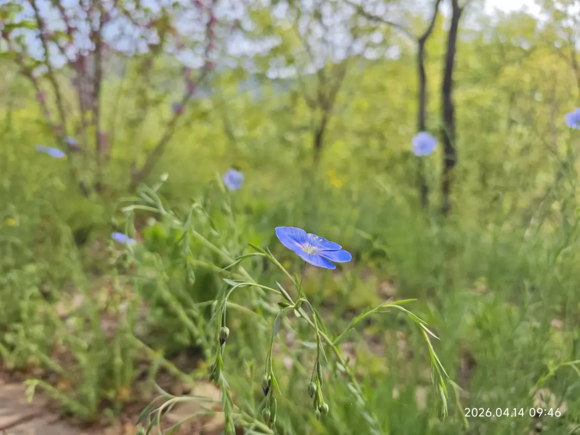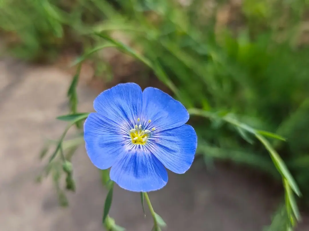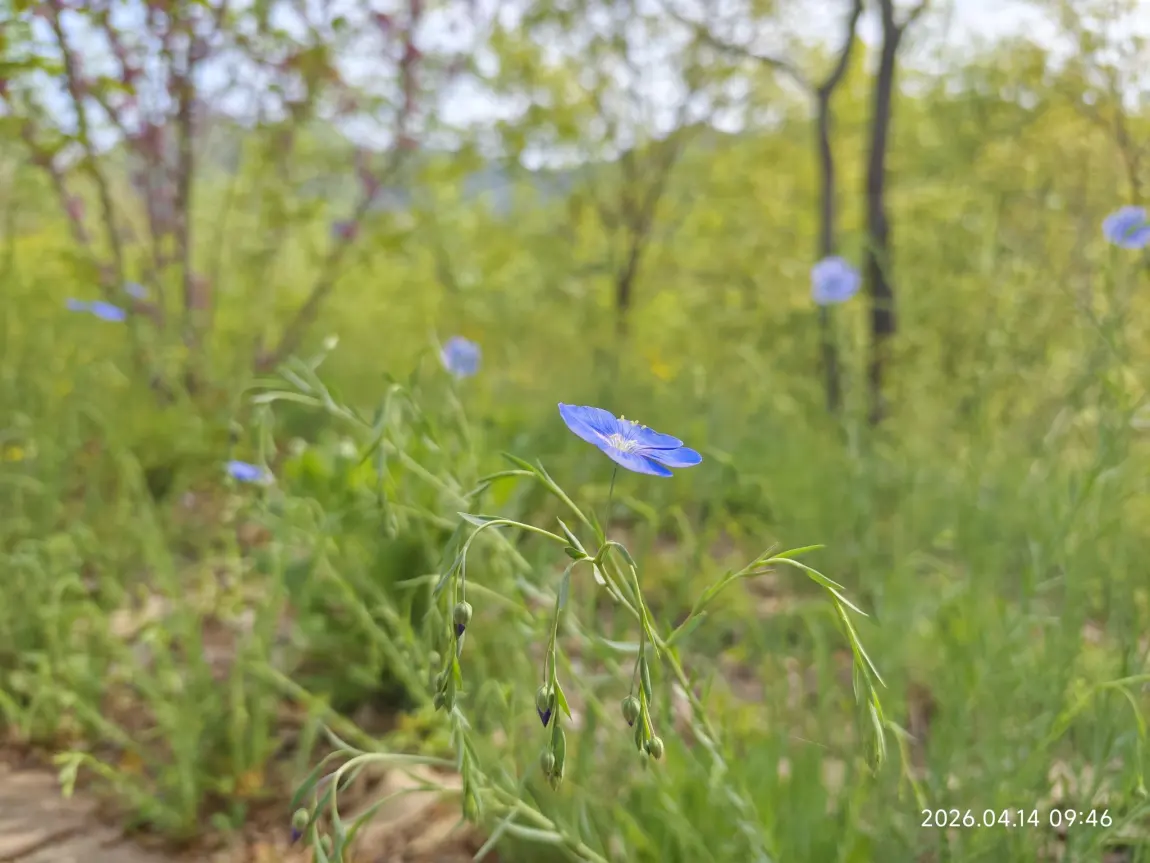 路边生着一片蓝亚麻花。花朵小巧,五片花瓣舒展,花色浅蓝,花蕊呈嫩黄,枝干细弱,随风轻轻晃动,不张扬,不艳丽,静静开在草丛间,与周遭草木相融。