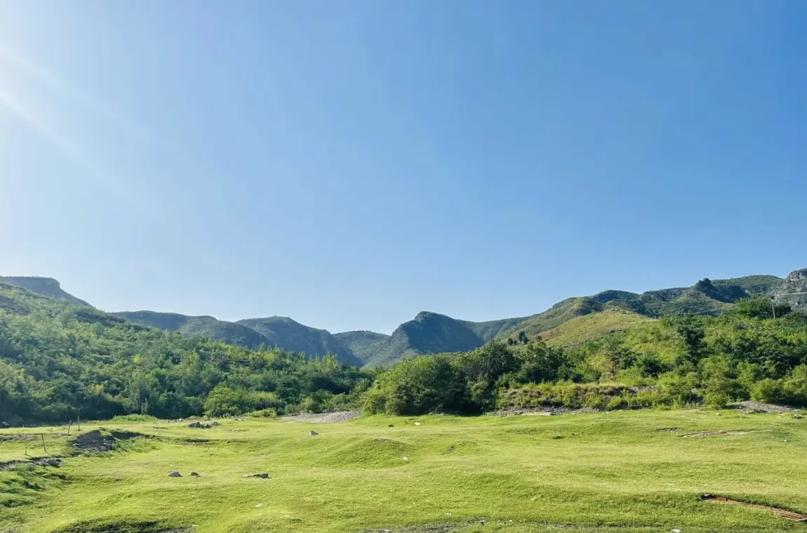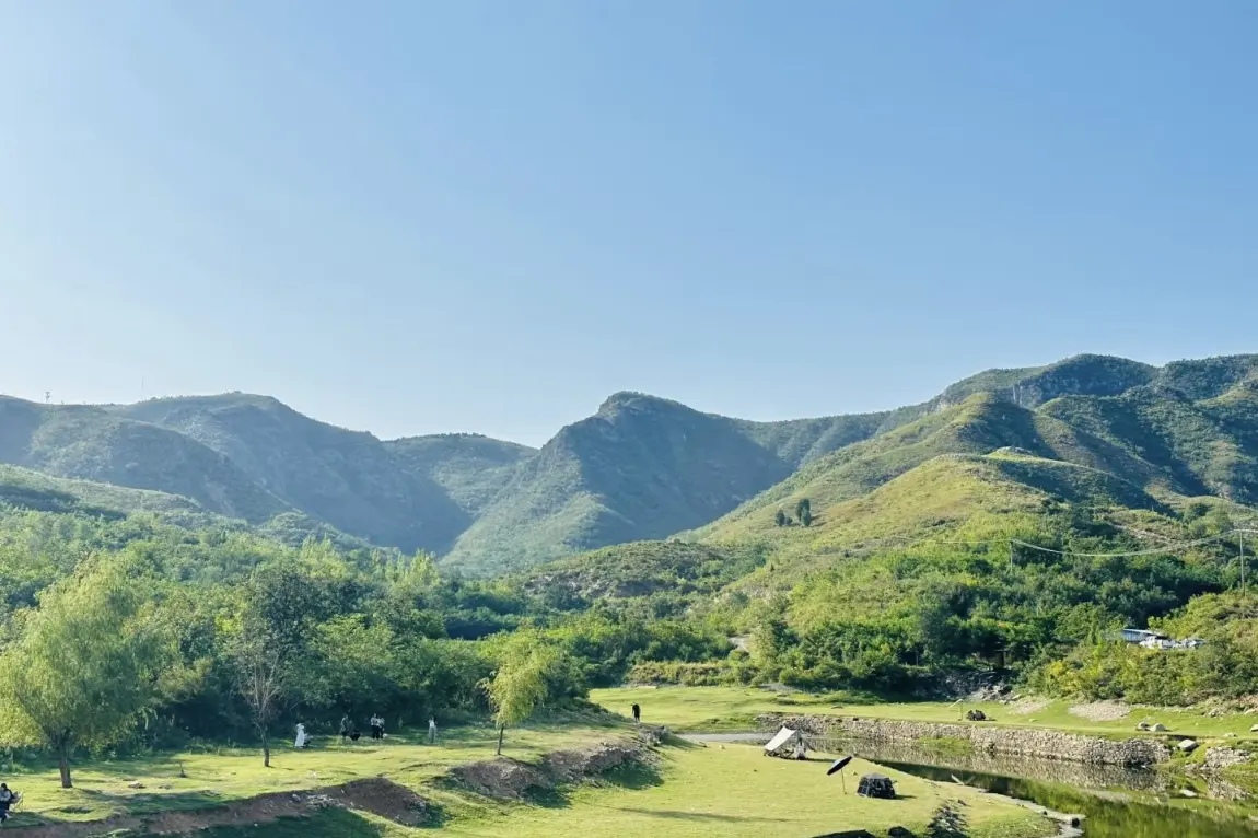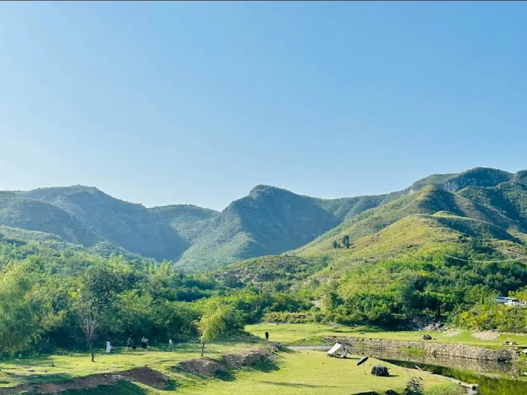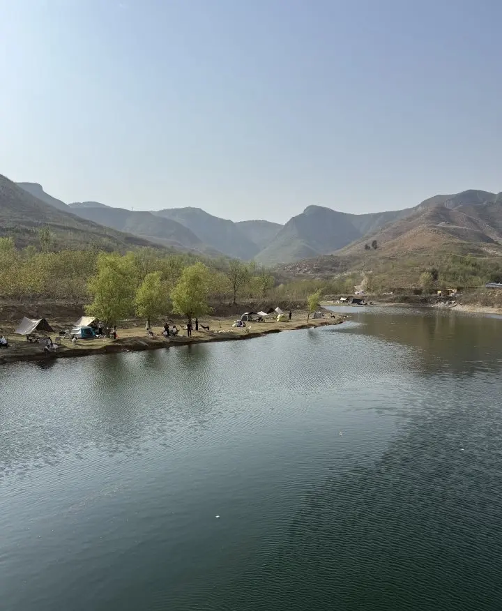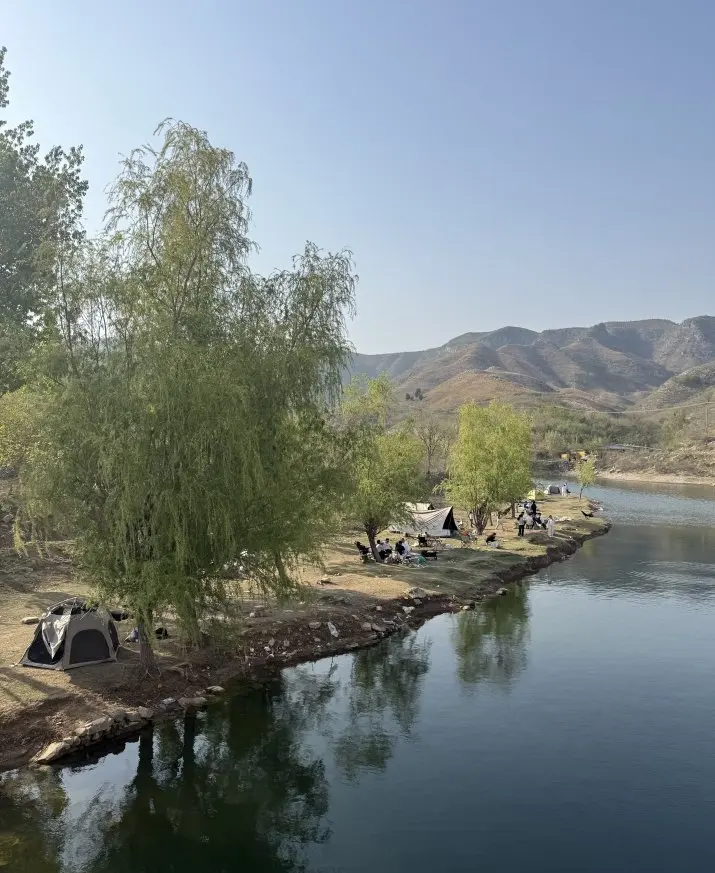 营地藏在山坳河湾处,大片平整浅草地,背靠连绵青山,面朝清透河水。岸边几棵垂柳垂着新枝,风过水面漾起细波,人少清净,没有景区的嘈杂。可以搭帐篷天幕,也能直接坐在草地上野餐,抬头就是蓝天和山影。