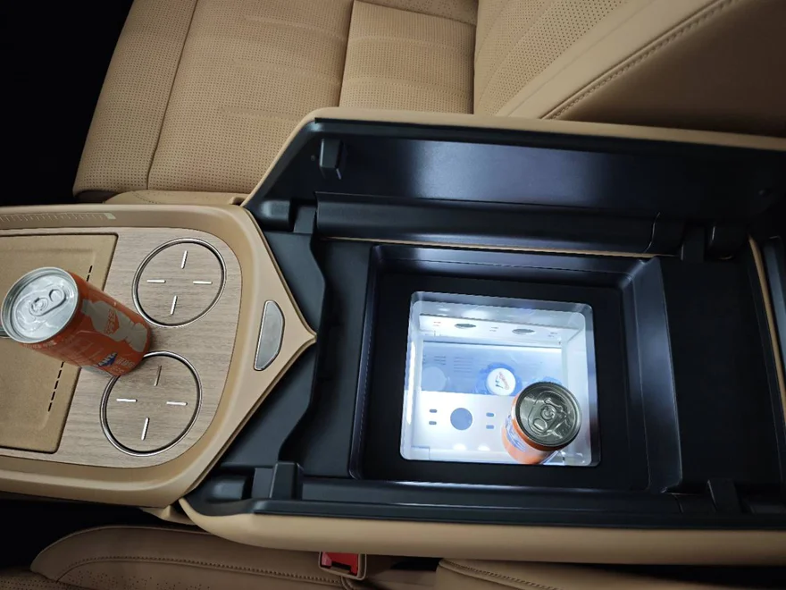 中控: 17.3寸大屏流畅度没得说,8295芯片够顶。后排21.4寸娱乐屏+33扬声器,影音体验拉满。冰箱能冻冰棍也能温奶,挺实用。