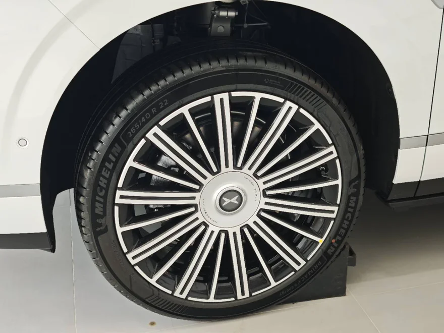 小鹏GX的22寸轮毂气场十足,多辐条悬浮设计很有高级感,行驶时车标还能保持正立。采用前265后285mm鸳鸯宽胎,配合后轮转向,让这台5.2米的大家伙转弯灵活、高速稳健。搭配米其林定制轮胎,颜值和操控都在线。