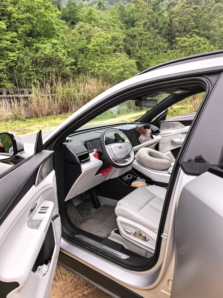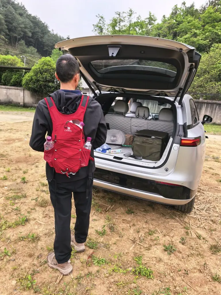 清晨的空气还带着微凉,我们把车停在山脚下的空地上。小鹏G9的后备箱被塞得满满当当:零食、水、防潮垫,还有给孩子们准备的“寻宝工具”。打开车门的瞬间,浅色系的内饰在绿意的映衬下格外清爽,座椅上还放着给孩子准备的颈枕,连细节里都藏着贴心。