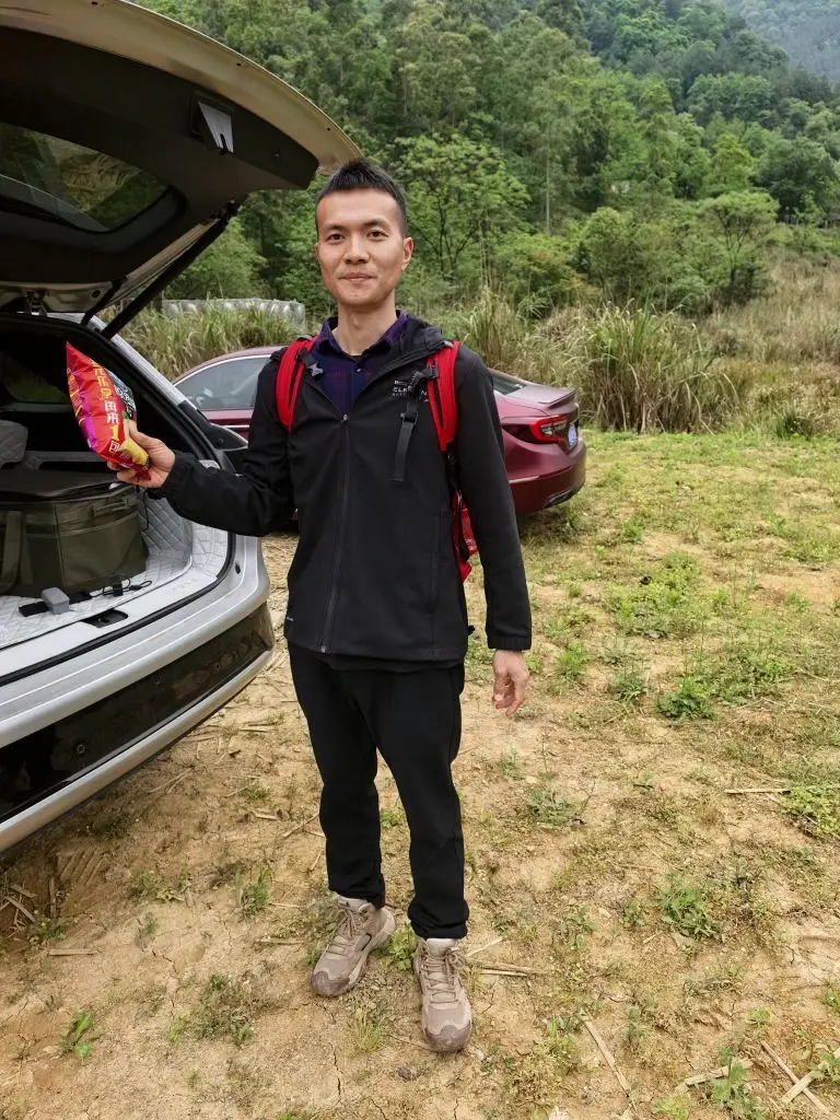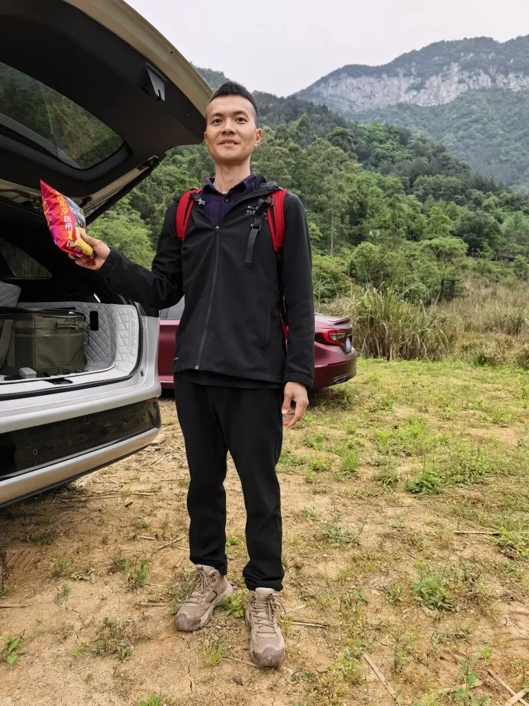 爸爸背上红色的登山包,手里举着一包零食,像个准备冲锋的“补给官”;女儿攥着同款零食,蹦蹦跳跳地跟在身后。后备箱里的装备箱、备用的水,都像是在宣告:这场徒步,我们是认真的。