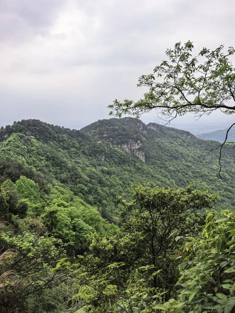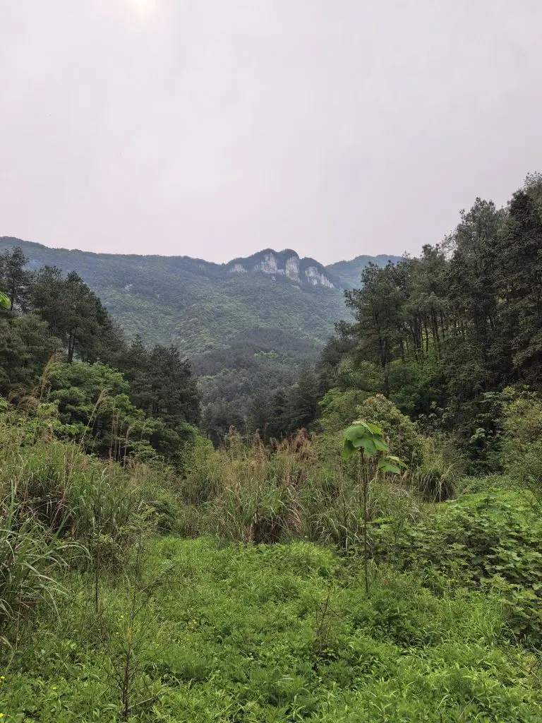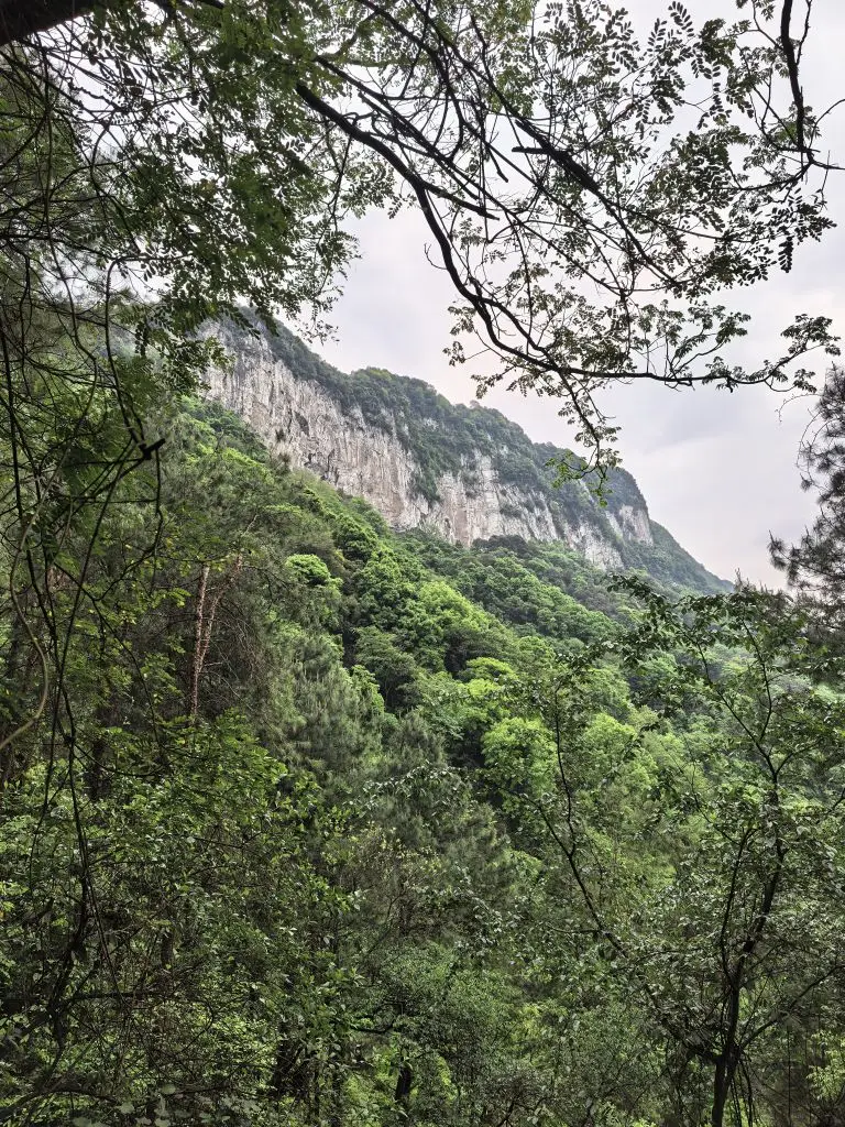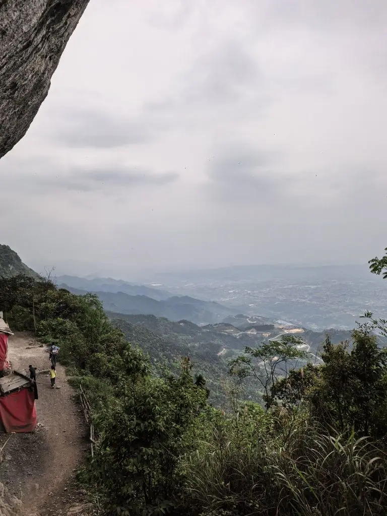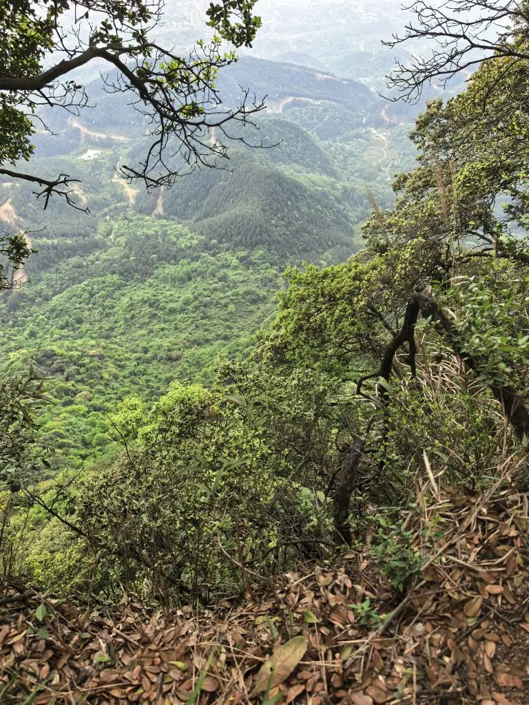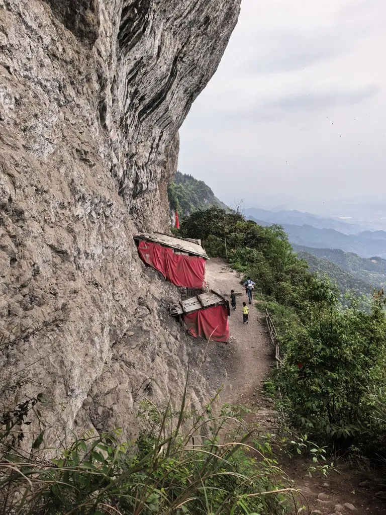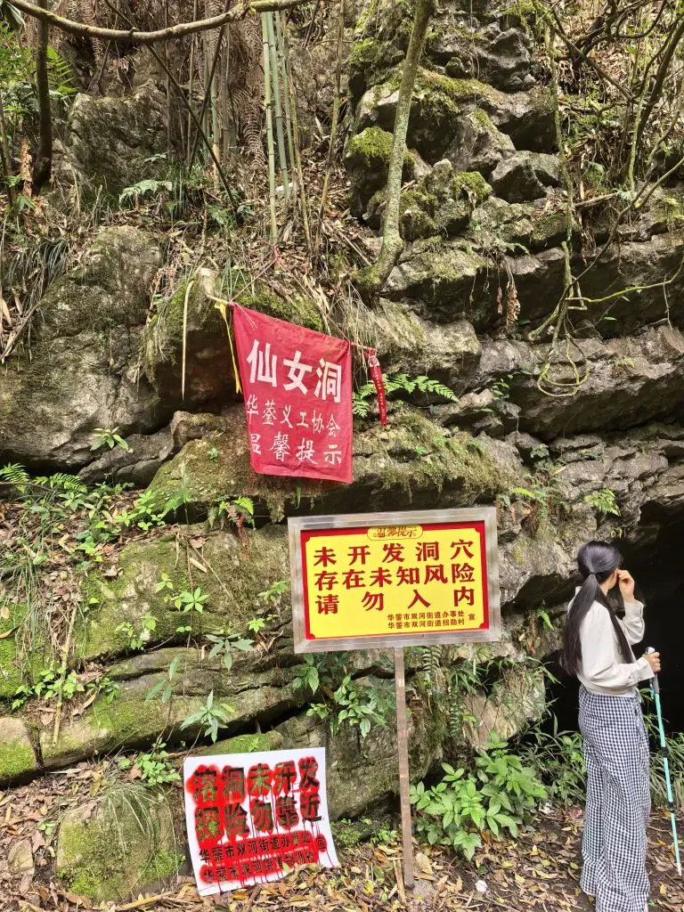 走到半山腰,一处悬崖边的小路出现在眼前。山壁上挂着红布的小屋,远处的城市轮廓在薄雾里若隐若现,风从山谷里吹上来,带着点凉意,却让人瞬间清醒。再往前,就到了传说中的“仙女洞”。洞口挂着醒目的警示牌,提醒着这里的原始与未知,我们只在洞口驻足,感受了一下山林深处的神秘气息。