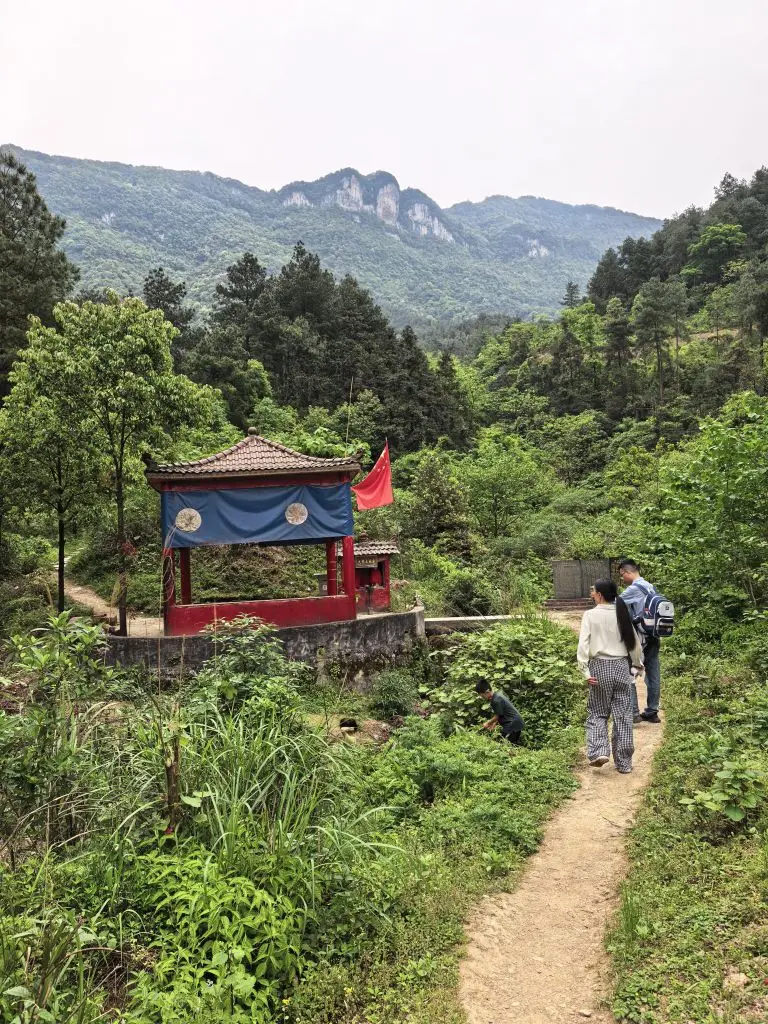 路上还遇到一座红墙蓝布的小亭子,像是藏在绿野里的秘境入口。孩子们好奇地往草丛里探脑袋,爸爸笑着跟在身后,妈妈拿着登山杖,一步步稳稳地走着。