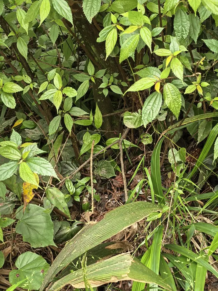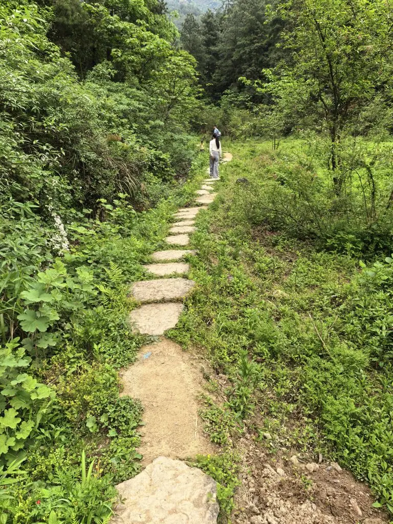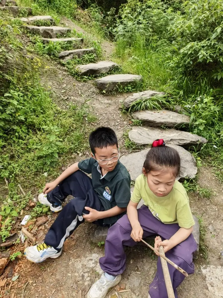 沿着蜿蜒的土路往里走,路两边的草木疯长,像是走进了被遗忘的秘境。女儿和小伙伴一开始还叽叽喳喳,没过多久就发现了新大陆:捡树枝、玩石头,在石阶上坐下来,用小木棍研究地上的木屑,专注得像两个小探险家。