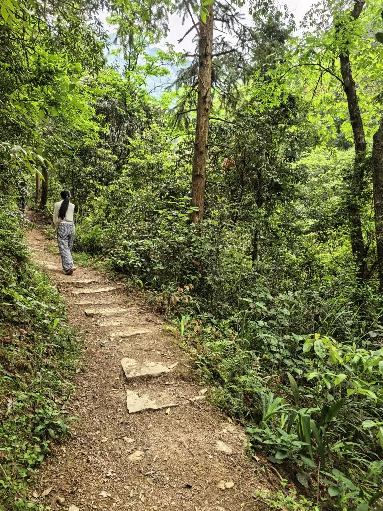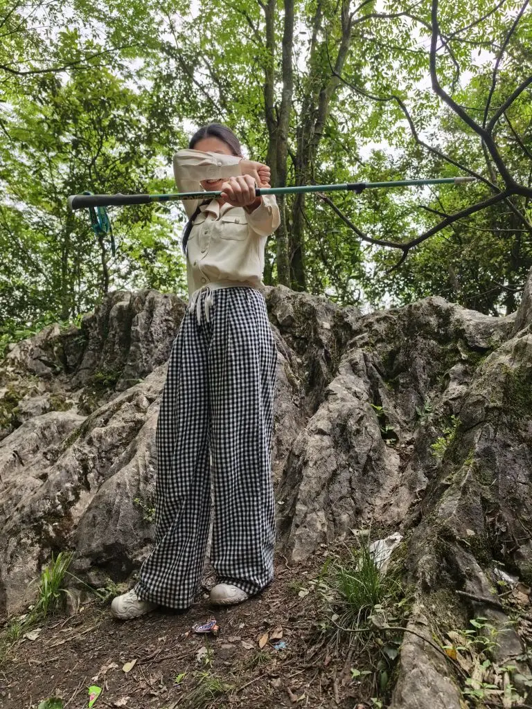 越往里走,路越原生态。石阶上铺满落叶,踩上去沙沙作响;竹林里的风穿过枝叶,带着淡淡的草木香。妈妈拿着登山杖,在镜头前比了个“瞄准”的姿势,藏不住眼里的笑意。我们一路走,一路停,看远处的白岩山壁在云雾里若隐若现,听山风穿过树林的声音,连脚步都慢了下来。