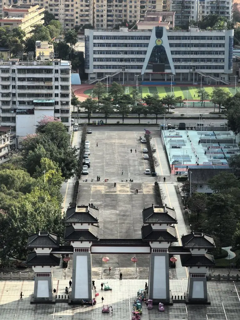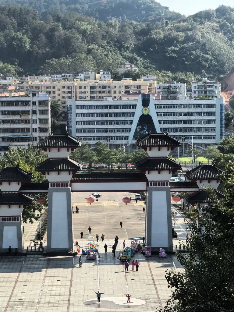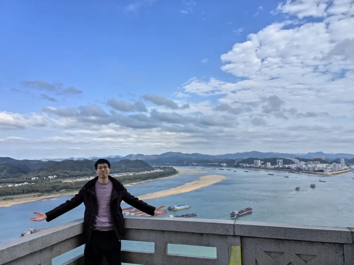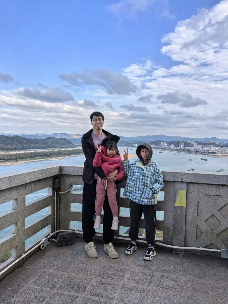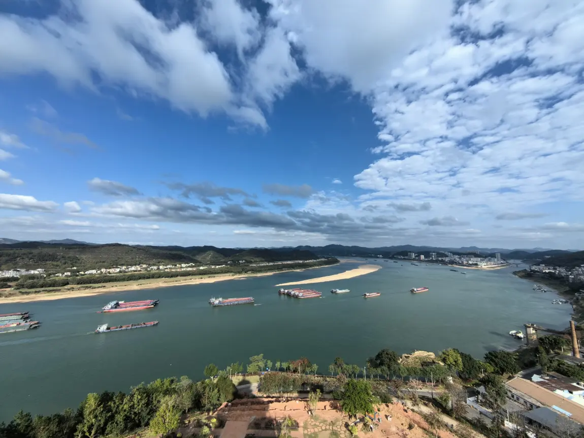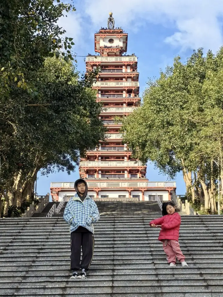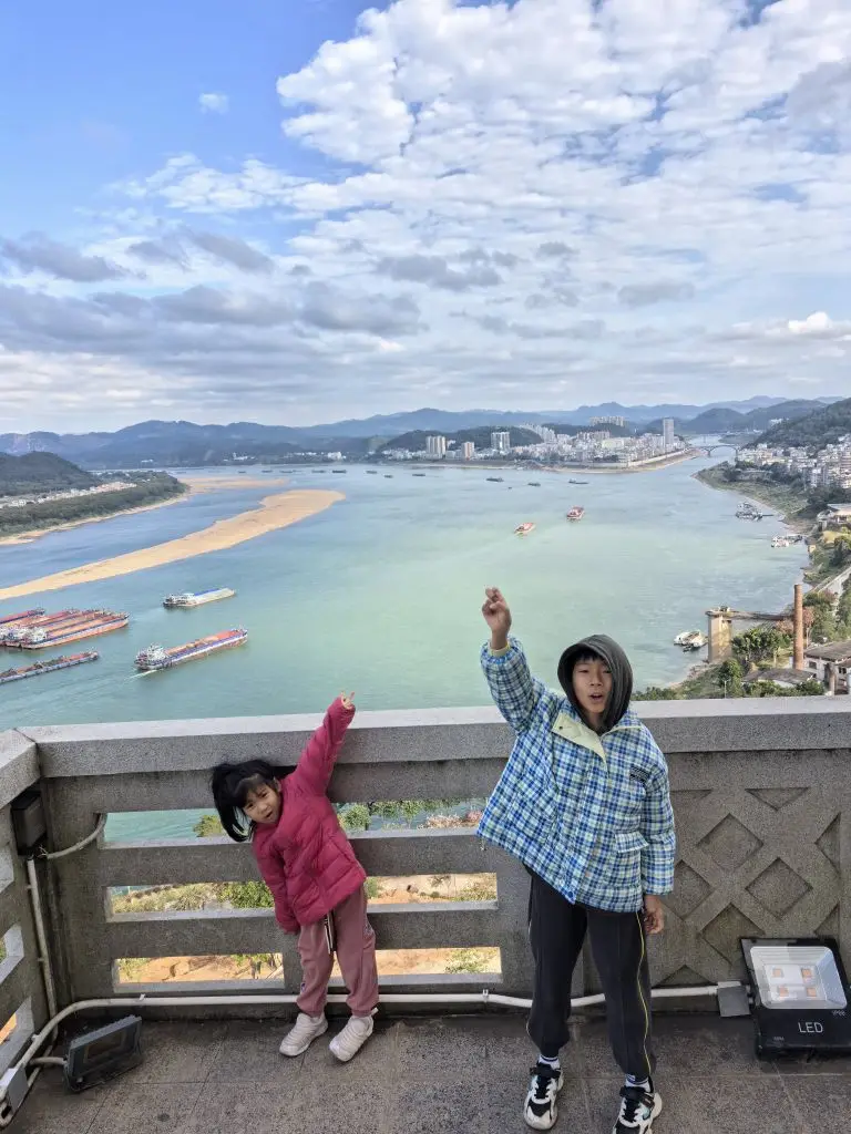 顶层视野完全打开:西江如一条银带蜿蜒而过,整座封开县城铺在眼前,远处青山叠翠。俩娃趴在栏杆上数船,我在旁边大口呼吸,觉得刚才那“广场台阶+塔内楼梯”的双重折磨,值了。