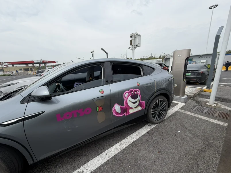 娃倒是不挑,吃着自带的小面包,喝着酸奶,就开心得不行。短暂休整后再次上路,午后的阳光更盛,车内温度适宜,娃玩累了,靠在安全座椅上沉沉睡去。车内安安静静,只有空调轻柔的风声和导航偶尔的提示音,我和老婆轻声聊着天,看着窗外的风景从江南水乡渐渐过渡到鄂东的丘陵地貌,山峦起伏,绿意更浓,那种一路向西、奔赴远方的感觉,特别治愈。第二次补能在鄱阳服务区。