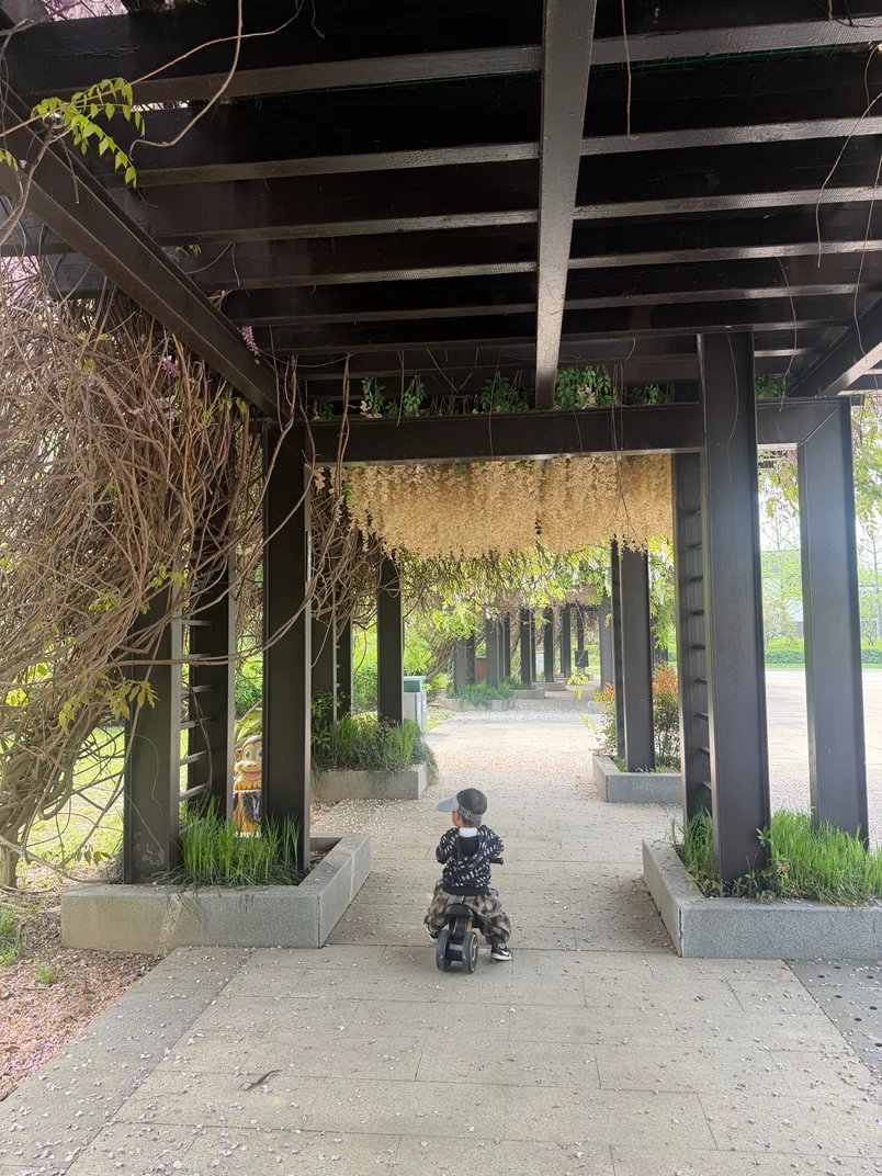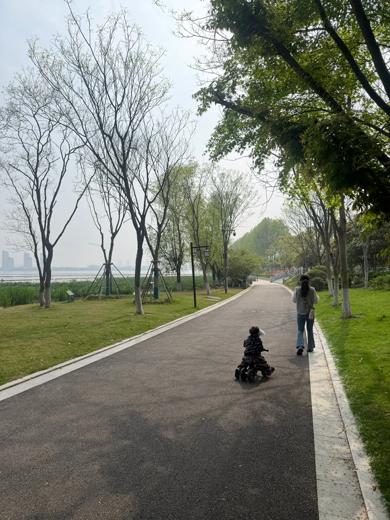 第二天一早吃了早饭,我们便带着娃直奔附近的遗爱湖公园。这是黄冈市区的城市绿肺,免费开放,公园超大,依湖而建,处处都是苏东坡文化元素。带娃慢悠悠地沿着湖边骑行。春风拂面,湖水波光粼粼,岸边柳树垂下万条绿丝绦,桃花、樱花开得正盛,粉白相间,美不胜收。