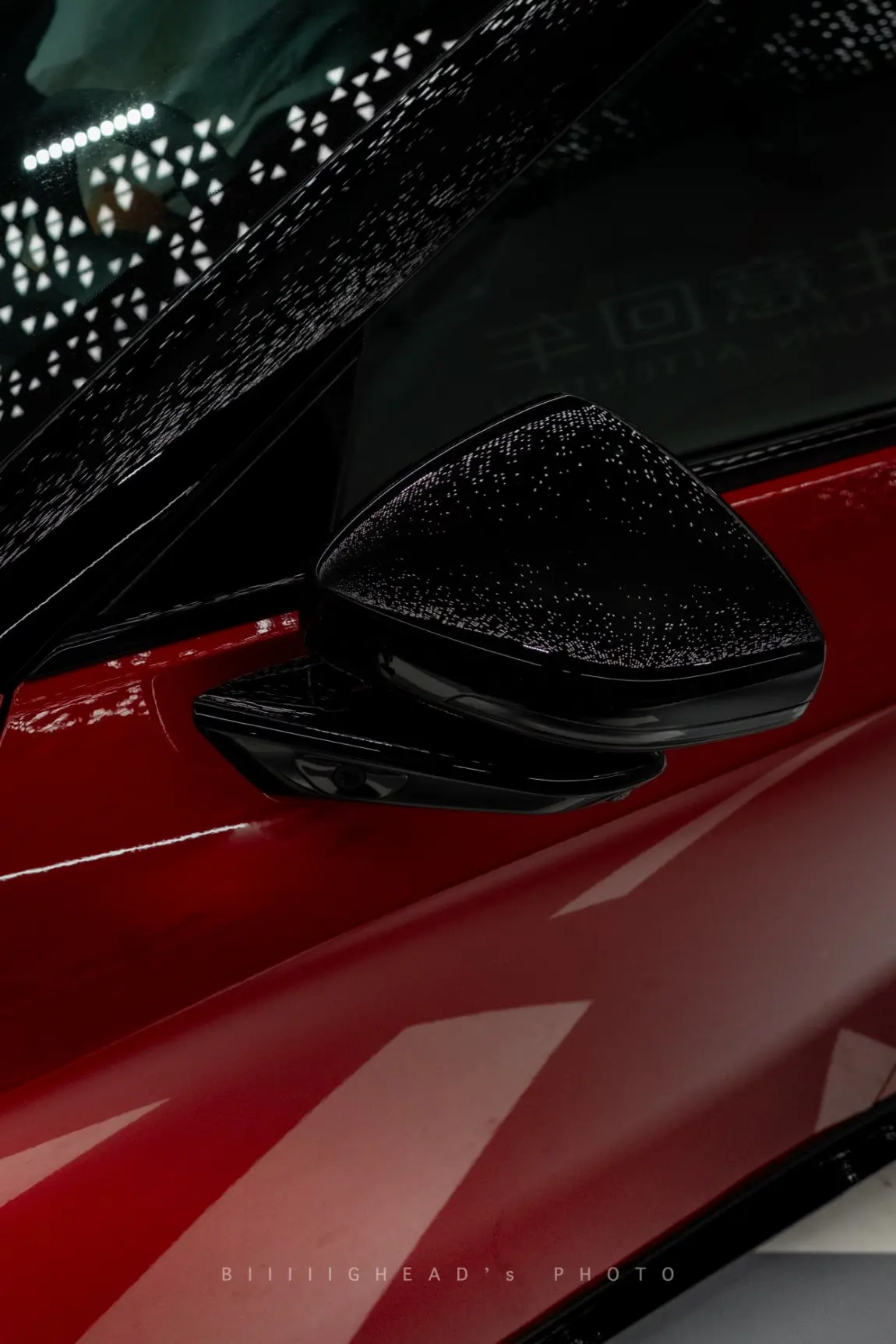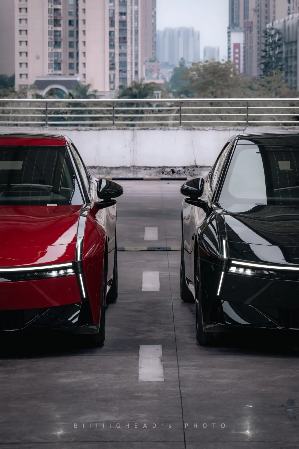 天台那组是最先拍的,空间够大,也够干净,主要就是让两台车好好“站在一起”。钢结构的线条配上红黑车身,对比很直接,画面也比较利落。