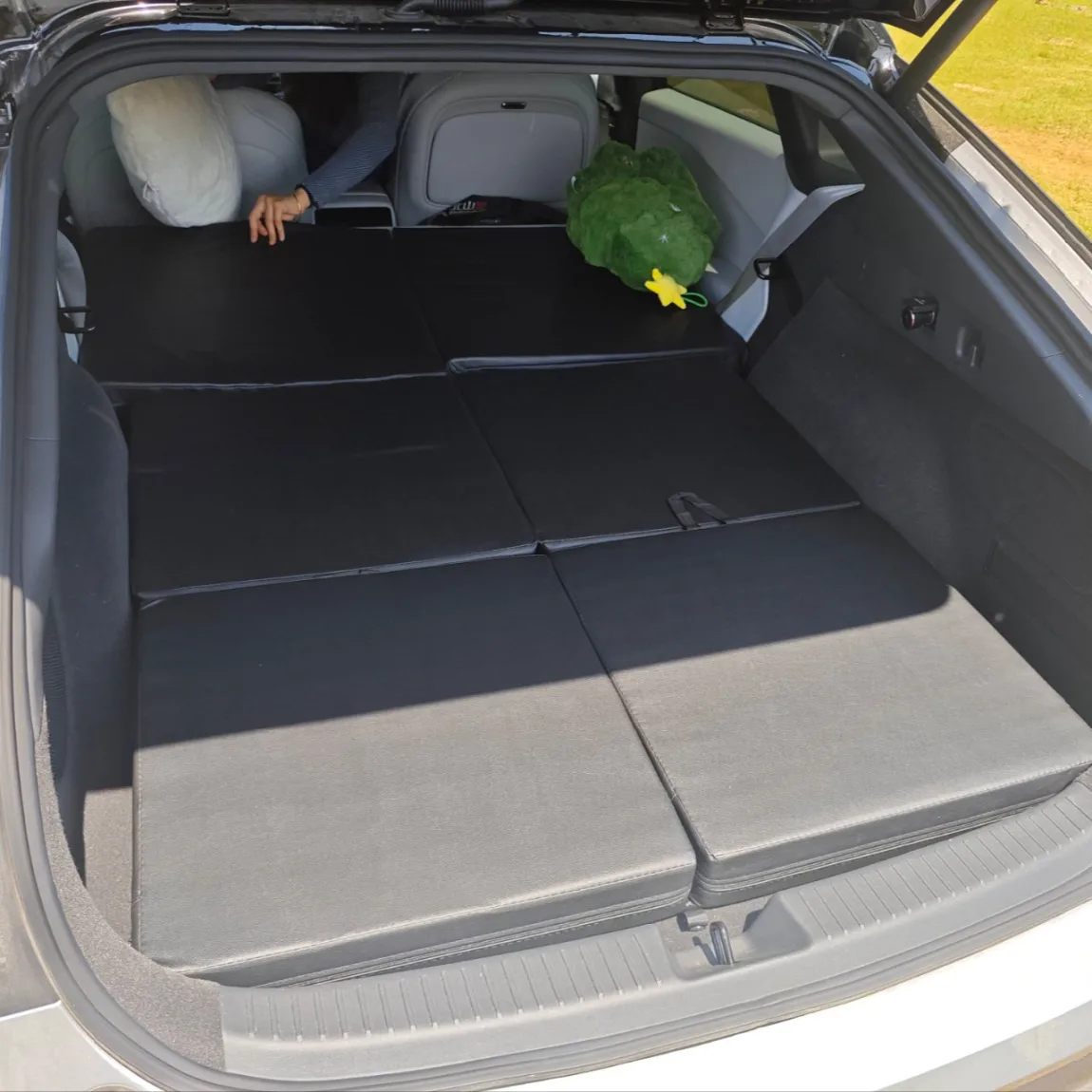 像我们打工人需要长期午休,一开车门就能睡,因为是三段式就算不收起来也不影响后备箱空间,是我目前看到所有方案里最方便的。柔软支撑性好且没有异味,不用晾直接就铺车里了,面料防水耐磨,擦一下就干净,外套还能拆下来洗,露营弄脏了也不怕,真的太无敌了。
