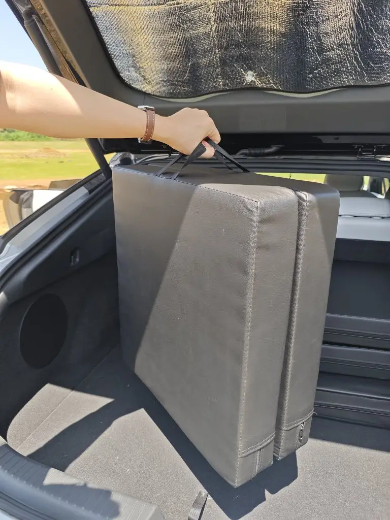 而且巨轻,整套加起来一只手就能轻松提起,随便塞进后备箱,完全不占地方,不用像充气床那样费劲打气放气,随时铺开就能用。三段式可折叠,收纳方便,自带提手,如果长期不用直接提回家找个角落一扔。