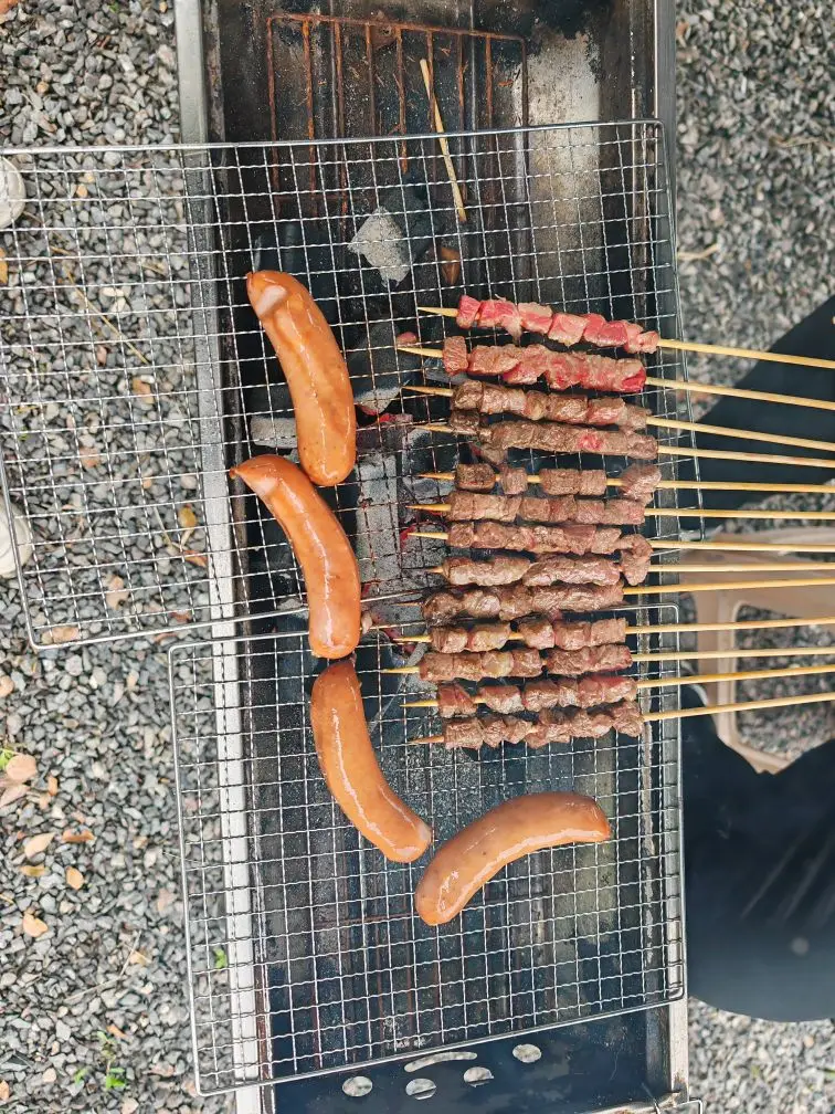 露营的灵魂,一定是一顿热气腾腾的烧烤。提前备好新鲜食材,生起炭火,肉串、烤肠在烤架上滋滋冒油,香气瞬间弥漫开来。