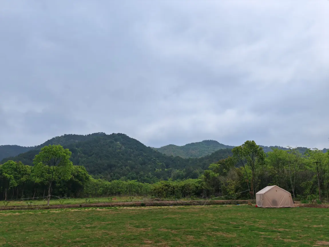 穿过茂密的林间小道,抵达藏在青山里的露营地。四周青山环抱,绿意盎然,营地草坪开阔平整,环境安静又治愈。