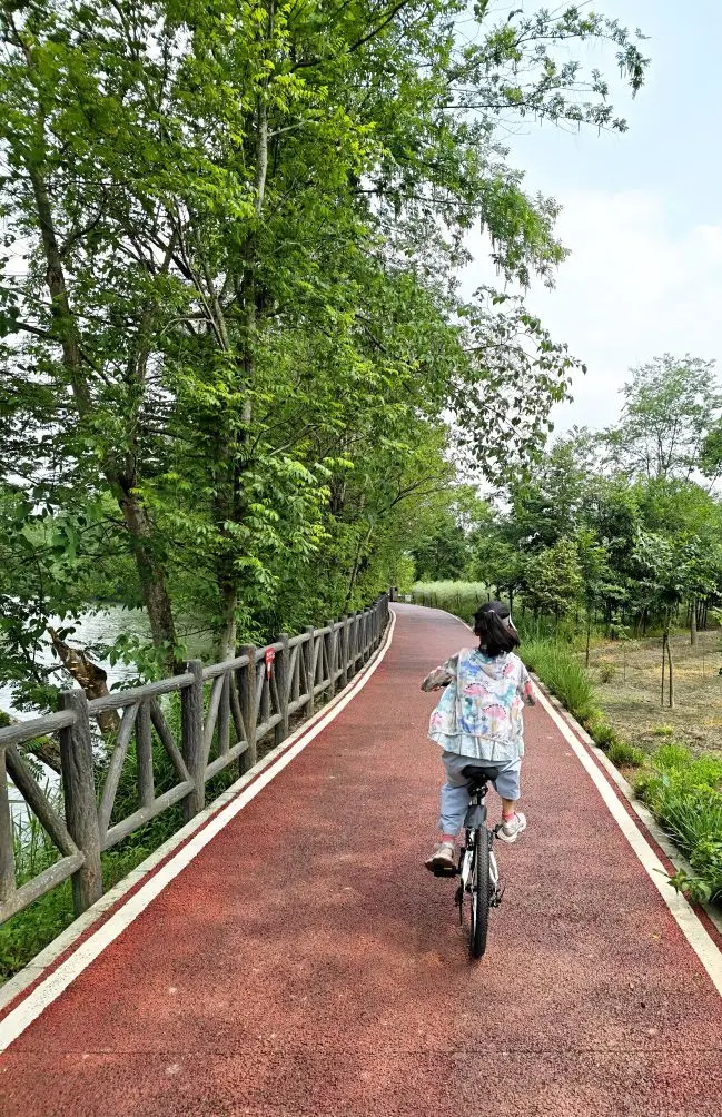 🌱沿着被绿树环抱的专属绿道慢慢前行,小朋友骑着小车,向着林间深处自在穿梭,背影和满眼葱郁融为一体,灵动又鲜活;大片开阔的青绿色田野铺展在天地间,满眼生机盎然,随手一拍都是治愈大片。