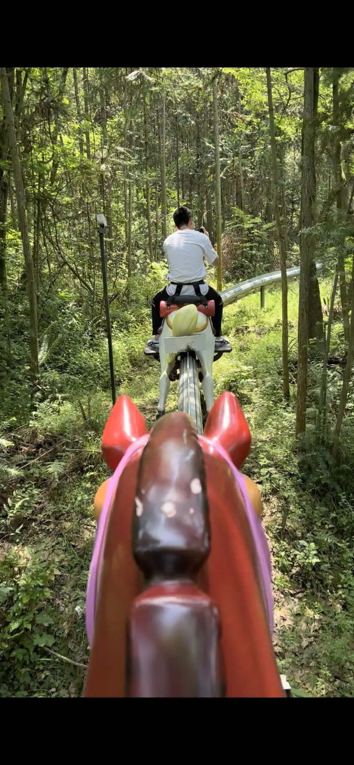 这里的木马造型可爱,坐上去慢悠悠晃悠,沿着平缓的山道上行,主打一个 “偷懒式登山”,不用费力爬坡,就能慢悠悠欣赏山林风光,孩子坐在木马上兴奋地晃着腿,沿途草木葱茏,微风拂面,惬意又轻松。慢悠悠骑完木马,再步行 5 分钟,便来到管式滑道入口。登顶之路毫不费力,全程几乎不用体力消耗,太适合带低龄宝宝了。