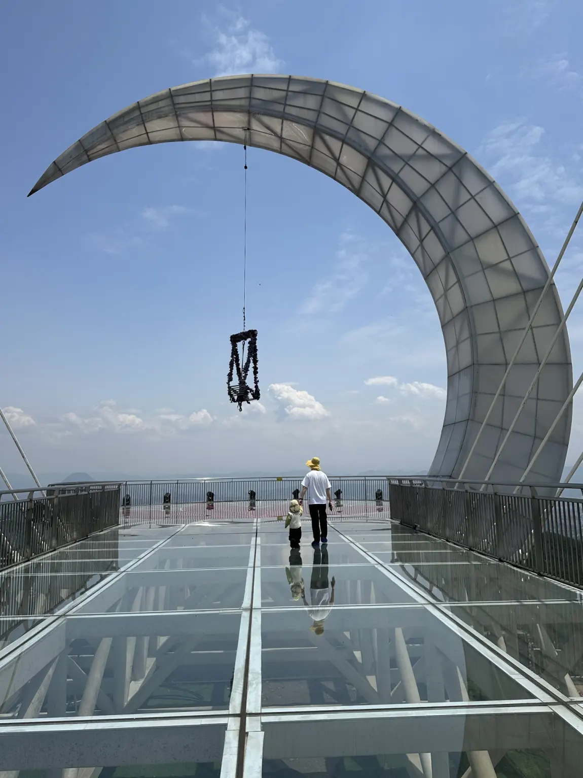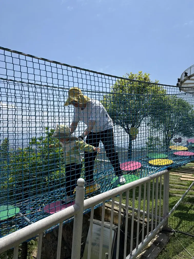 抵达山顶,瞬间被眼前的风景震撼!玻璃栈道悬空而建,站在上面视野开阔,漫山遍野的绿意层层叠叠,远处的村落、田园尽收眼底,山风呼啸而过,既有漫步云端的刺激,又能沉浸式感受大自然的壮美。孩子小心翼翼地牵着我的手,一边欢呼一边欣赏风景,随手一拍都是绝美大片。