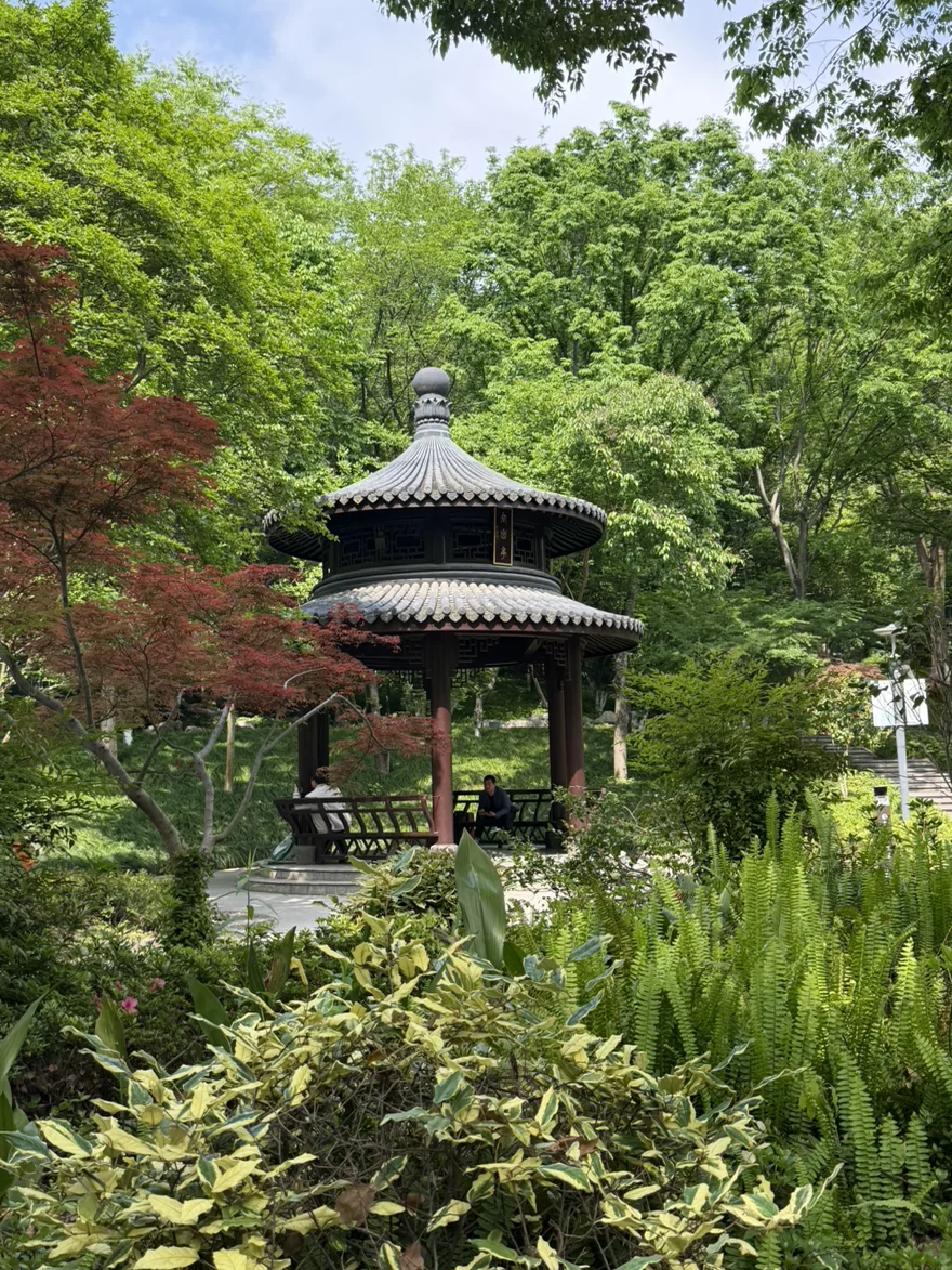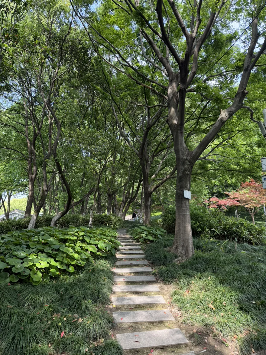 这次的目的地是海宁西山公园里的紫微山。海拔不高,台阶平缓,是那种"穿一双普通运动鞋就能上"的友好级山头,特别适合周末半日徒步。山门口绿意已经满了,风从竹林里穿过来,刚下车就先深呼吸了三口——城里那股焦躁感,被一阵山风吹散了。