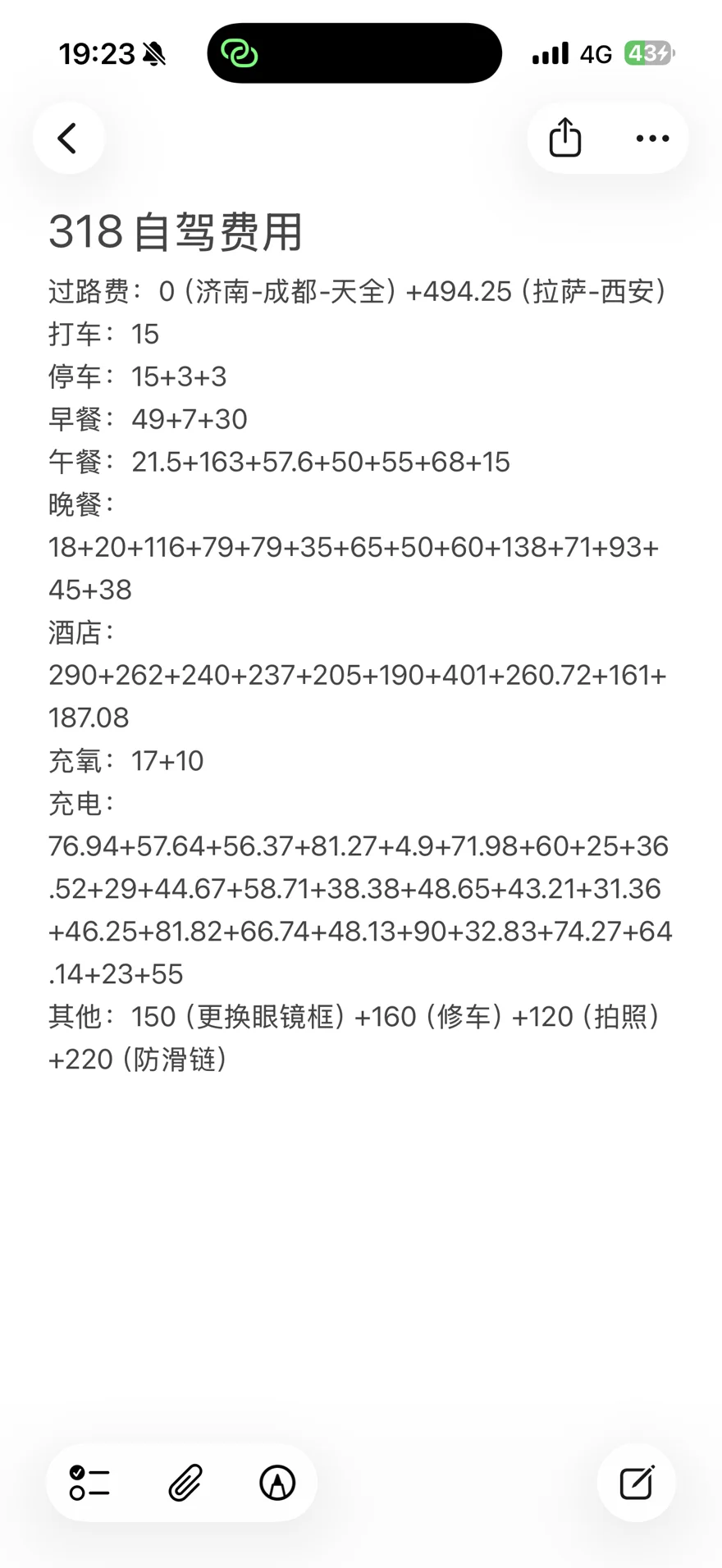 过路费比较低,是因为赶上清明节假期去的时候高速没有要钱,回来的时候他又花了1000块钱过路费,整体上花费比较高的还是住宿,还是海拔高的问题,住宿可能舒服一点,均价大约都在250左右,整体上还可以