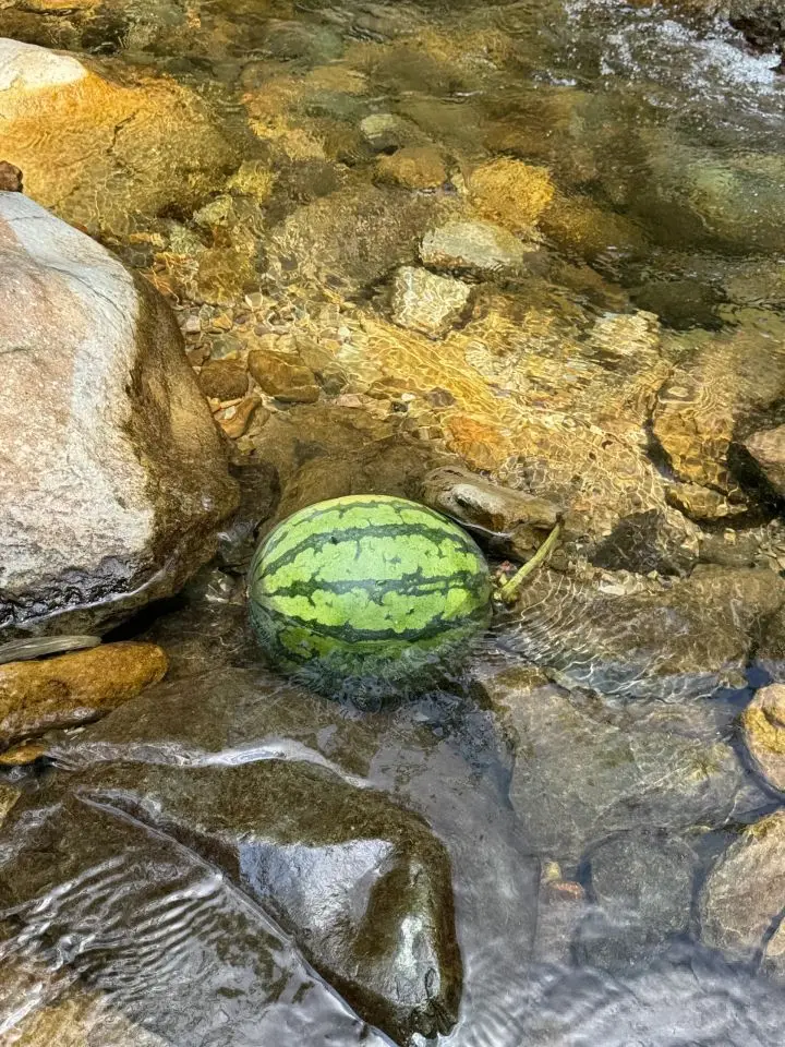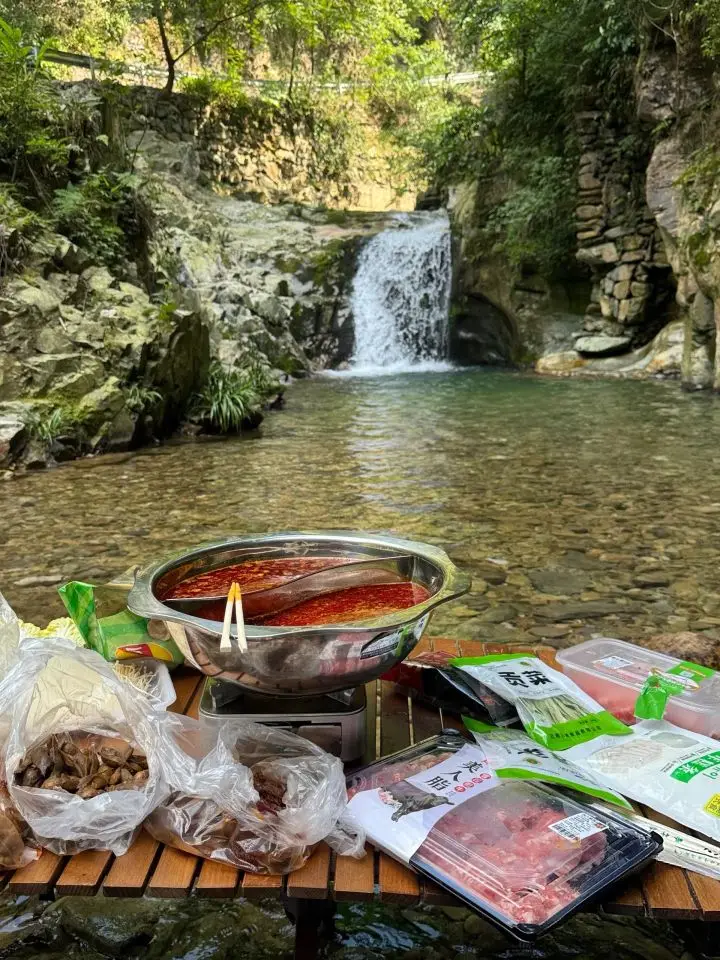 跟着图片指示,我们就能来到一块绝世宝地,有水有小瀑布,带着游泳圈还能在小水潭里面游泳🏊,特别是在水中摆上小桌子,坐在椅子上赤脚踩在水里,吃着火锅🥘,那滋味可别提有多舒服了!带来的水果还能放在溪水里凉快凉快,当冰箱使用(仅限于带皮的水果),西瓜🍉就特别好,直接吃上冰镇西瓜,哇塞的很!