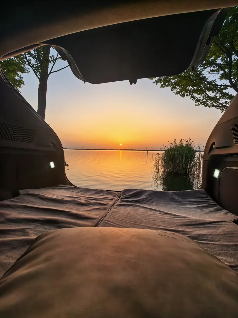 不得不说,后备箱视野一流,视野毫无遮挡,山湖美景尽收眼底,享受大自然带来的晚风温柔,目光所及之处,皆是治愈人心的自然风光。