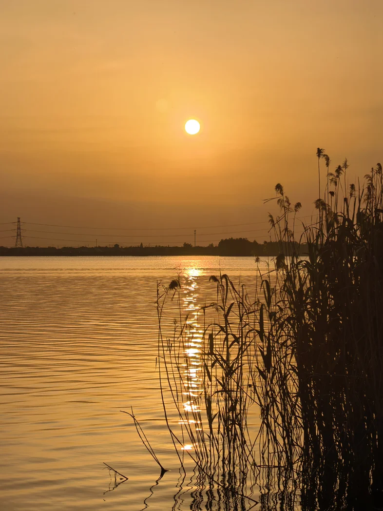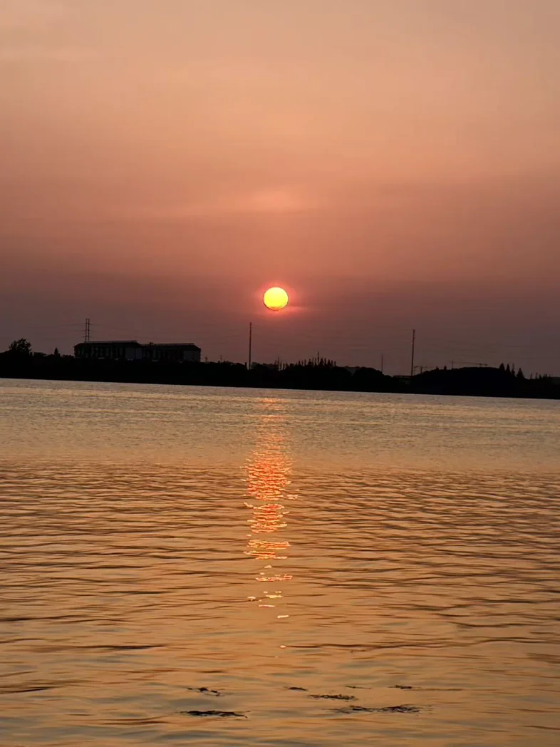 这一场夕阳西下,落日缓缓沉向湖中,你看,天空揉成橘红、暖黄、粉紫交织的温柔色彩
