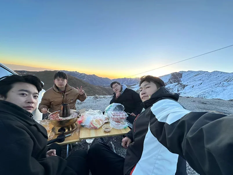 风虽然冷,但吃着热气腾腾的火锅,看着眼前连绵的雪山和翻涌的云海,这种感觉真的太奇妙了。旁边路过的几辆车都特意停下来看我们,还有人过来问我们冷不冷,说他们本来也想带火锅,结果怕风大没敢带。我们还热情地分了几包丸子给他们,大家围着火锅边吃边聊,别提多开心了。