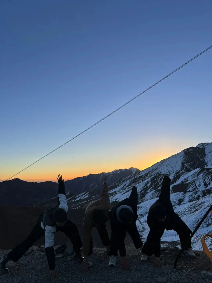 看完日出最爽的环节来了!我们在绕到垭口旁边一个背风的小山坳,早就已经支起折叠桌,点上炉子,直接在雪山脚下煮起了火锅!